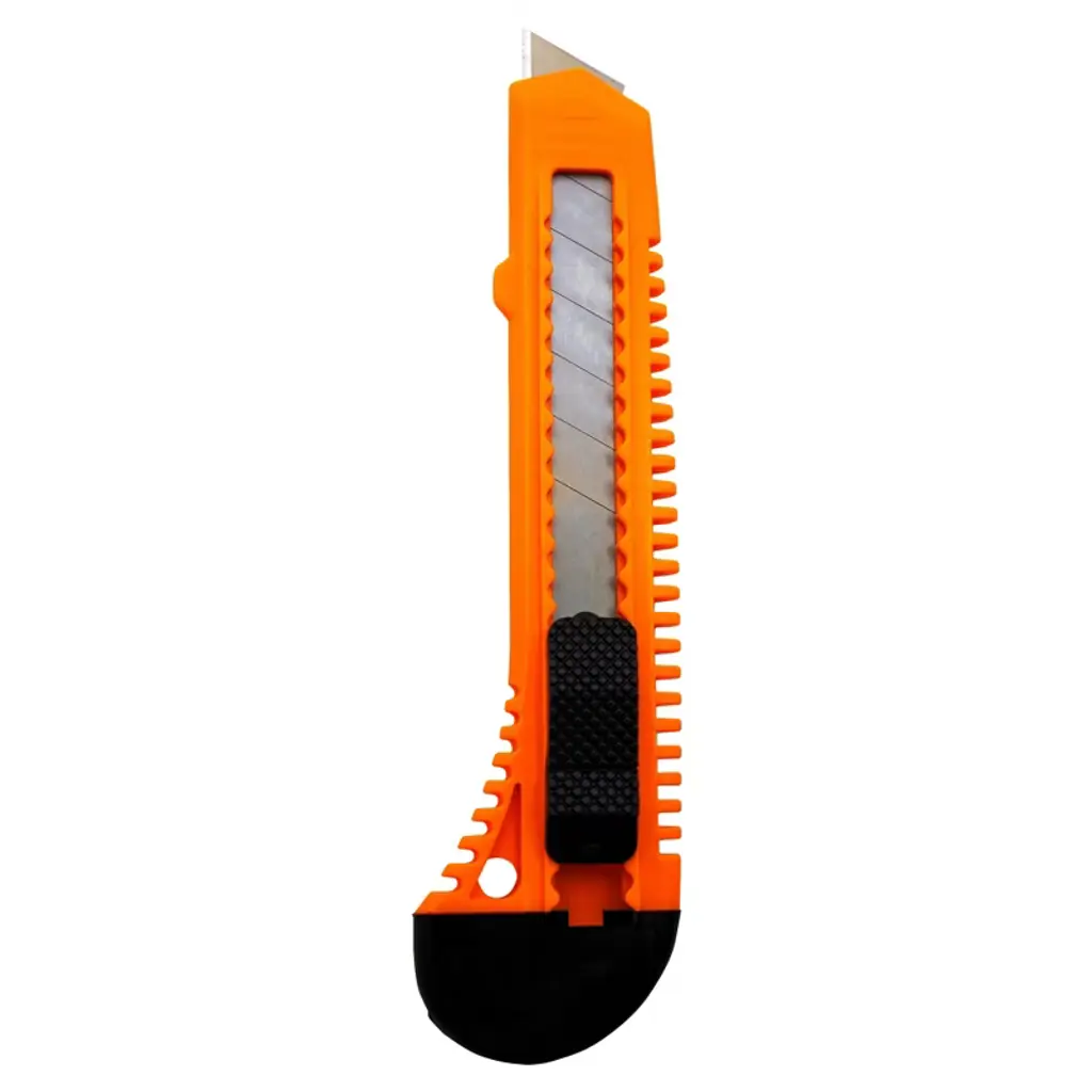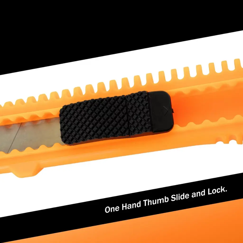 FEATURES: THREE (3): Neon Orange Utility Knife Box Cutters. 6.00ins Long. 3.00ins Usable Blade. Retractable Blade. One Hand Thump Slide and Lock. 3/4in Wide Snap Off Blade. 7 Snap off Segments for New Tip. Black Knife End used to Snap Blade. Blade is Replaceable. NOTE: Each order is for THREE (3) knives: