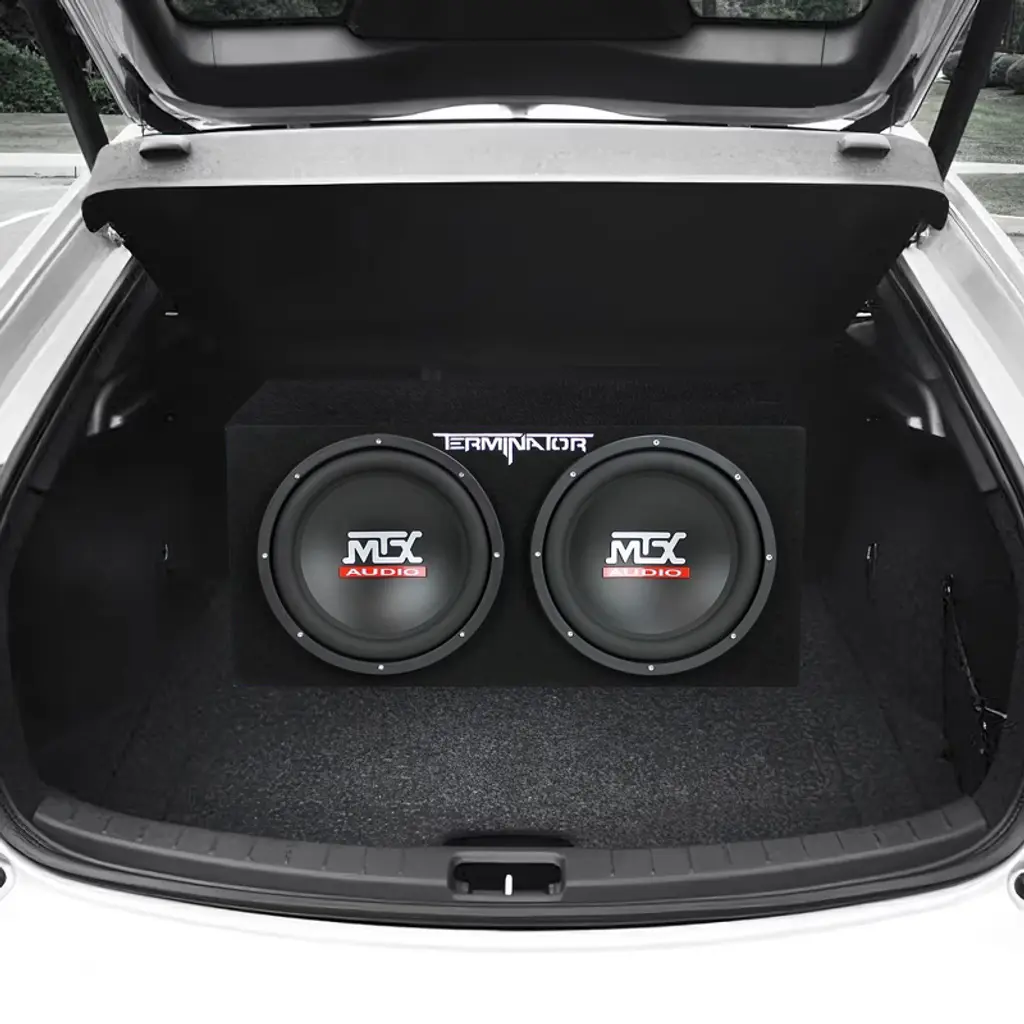Enhance your car audio experience with the MTX Audio Terminator Series TNE212D. This exceptional fusion of premium subwoofer and enclosure design surpasses expectations, delivering unrivaled bass performance. The dual 12-inch sealed enclosure packs a punch with a commanding 1200 watts of maximum power, supported by a consistent 400-watt RMS. Prepare for an audio journey defined by powerful, deep bass that sets a new standard. This powerhouse includes subwoofers boasting a 2-inch aluminum single 2-ohm voice coil and a robust 48-ounce magnet. These components work in harmony to produce deep, crystal-clear bass. The subwoofers also incorporate Spider Plateau Venting, a mechanical cooling method ensuring continuous air circulation for effective heat dissipation. We appreciate the challenges of the road, so our subwoofers have tough polypropylene dust caps to handle the trunk's wear and tear. Their lightweight design ensures they move efficiently with low power use, enhancing your audio system's performance. The enclosure is carefully made from strong 5/8-inch MDF (Medium Density Fiberboard), ensuring the necessary structural integrity for outstanding sound quality. Its black carpet cover not only adds a stylish touch but also keeps your subwoofers securely in position. With the MTX audio logo and Terminator logo, this subwoofer system combines great performance and style, making your car look and sound better.
