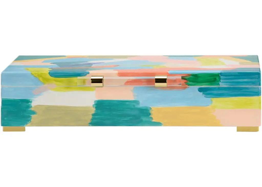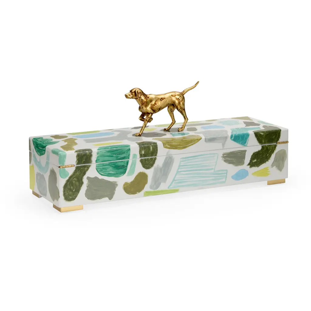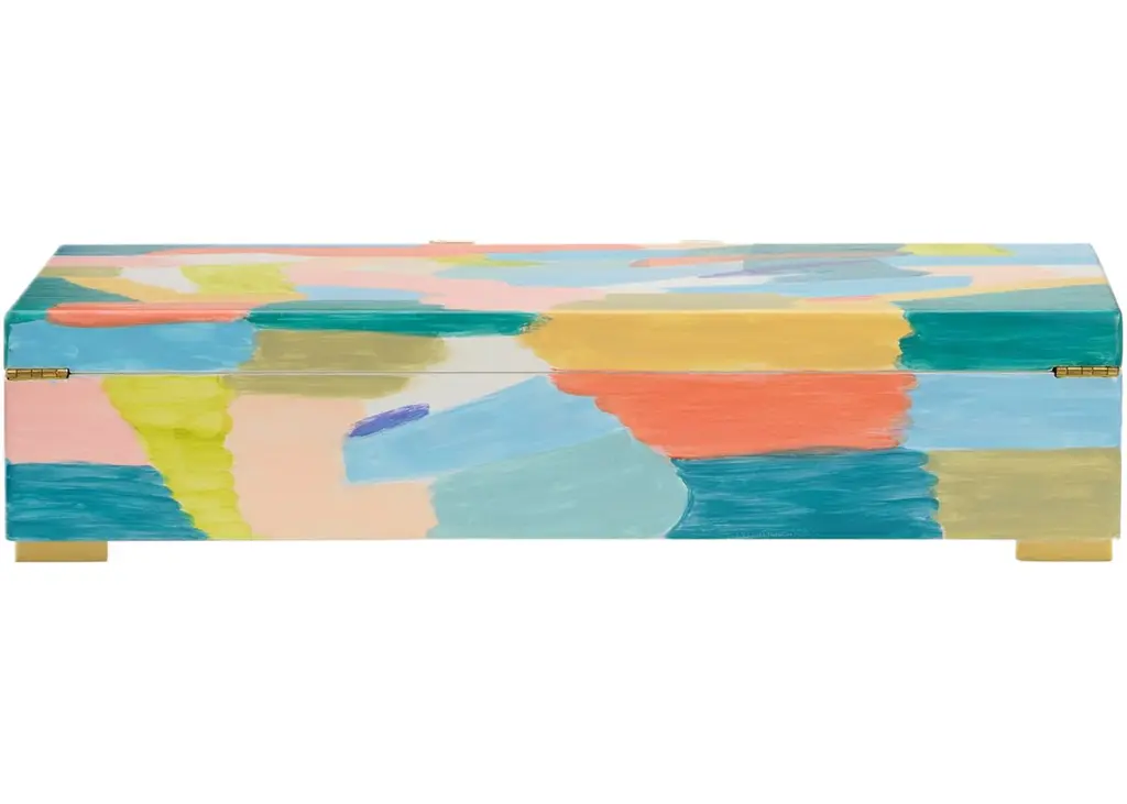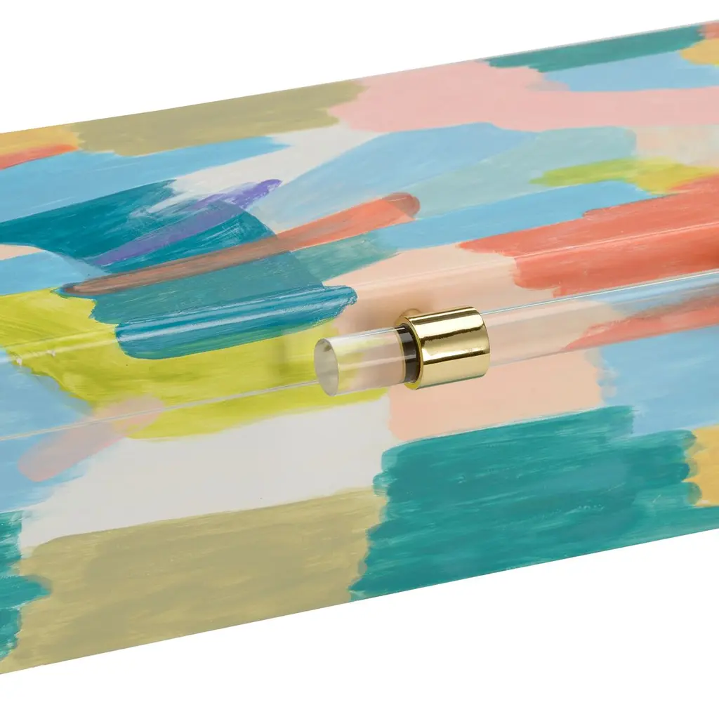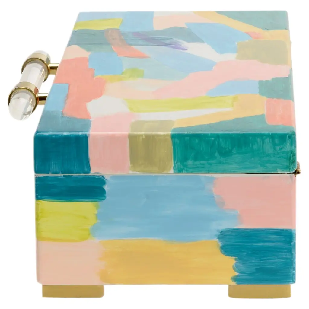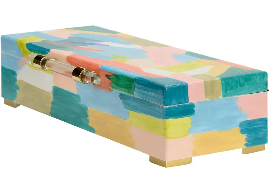 Hand painted wood box with a hinged lid, featuring a sleek acrylic handle with brass accents and gold triangular feet. Designed by Elaine Burge.