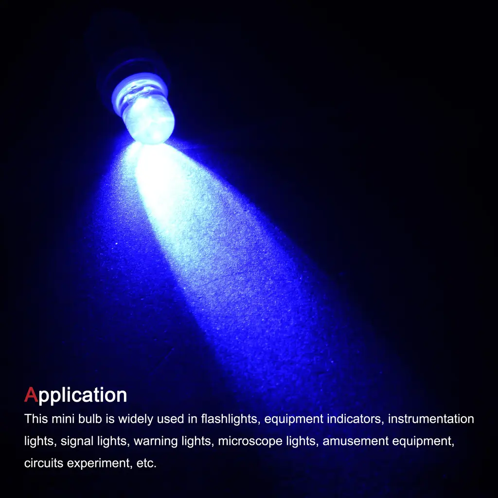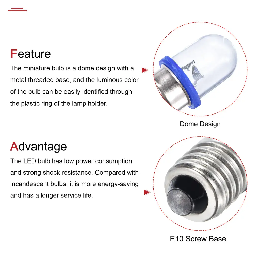 What is this?The miniature bulb is designed with a metal threaded base, and the color of the bulb can be easily identified through the plastic ring of the lamp holder. Widely used in flashlights, equipment indicators, instrumentation lights, aircraft and ship signal lights, warning lights, microscope lights, amusement equipment, circuits laboratory, etc.Are there any advantages of the product?The LED bulb has low power consumption and strong shock resistance. Compared with incandescent bulbs, it is more energy-saving and has a longer service life.How to use it?Easy to install, remove the old bulb from the lamp holder and screw in the new one.What should I notice?The side of the lamp holder is negative, and the bottom is positive.