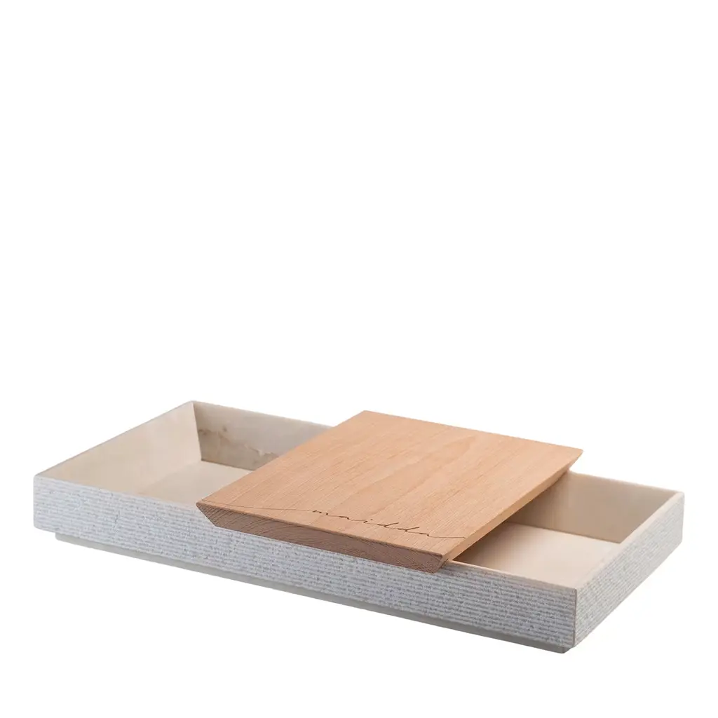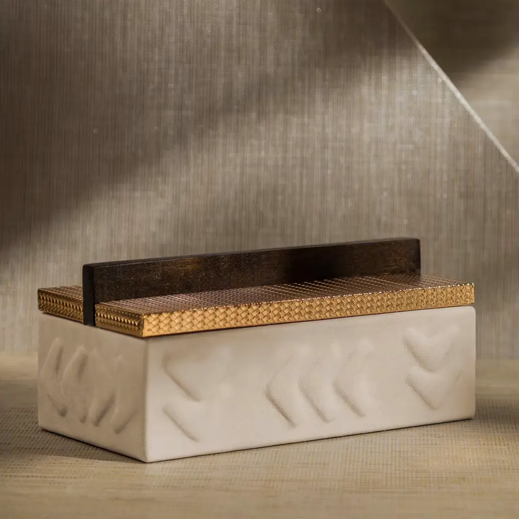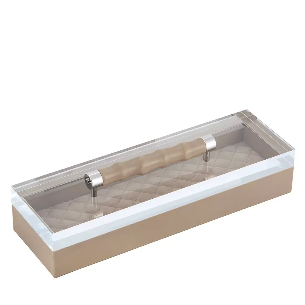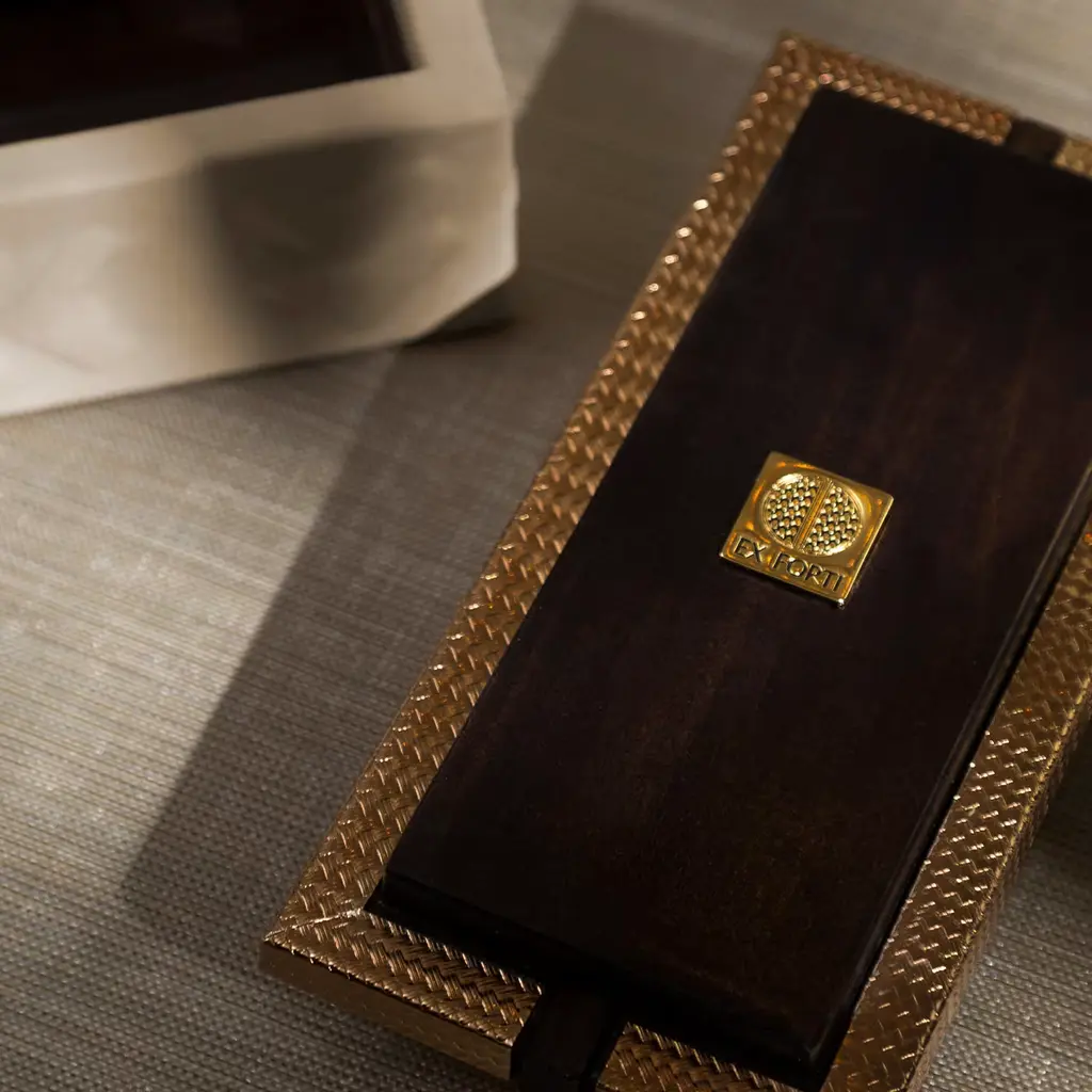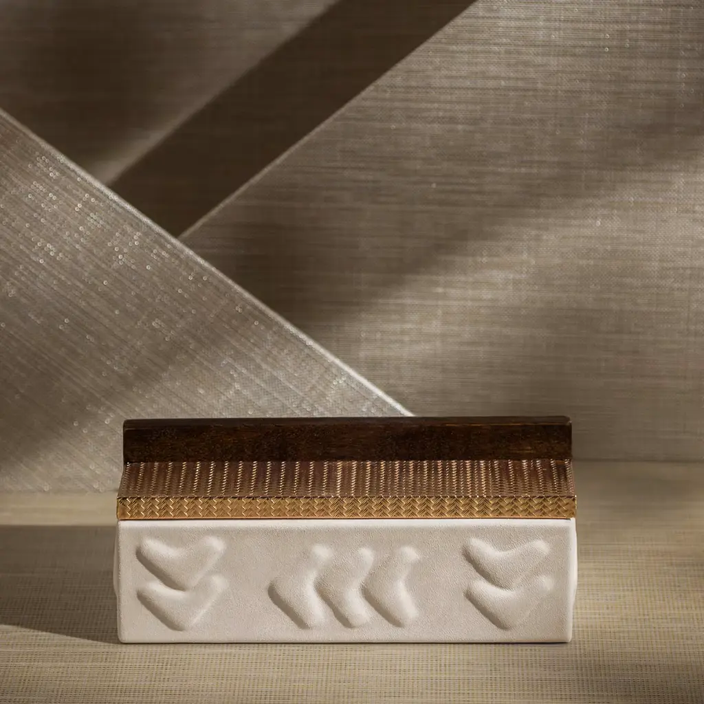 Deft craftsmanship and fascinating tributes to distant artistic styles merge in this splendid box, deftly handcrafted from solid Canaletto walnut and embraced by beige Nubuck leather. Raised shapes borrowed from pre-Columbian art create the appealing texture characterizing the box's sides, their curves softening the rigor displayed by the dazzling, mesh-like brass lid and by the linear wooden knob, a thoughtful homage to Rationalist volumes.