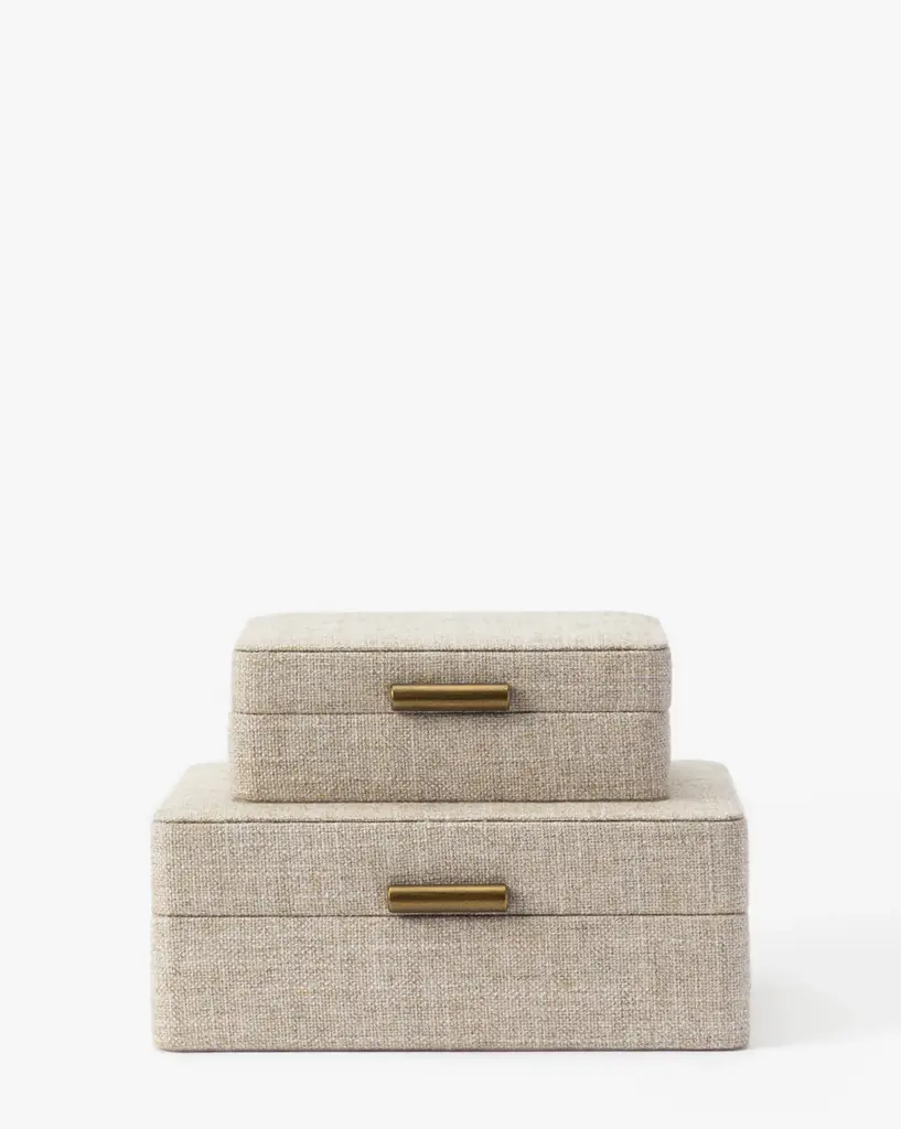 Finished in an off-white textured fabric, the Natural Fabric Boxes are subtly elegant decorative boxes to add height and interest to your nightstand or built-in shelf styling. Complete with a sleek iron handle for a mix of materials that boasts thoughtful design, the decorative boxes also serve as small, functional storage space.
