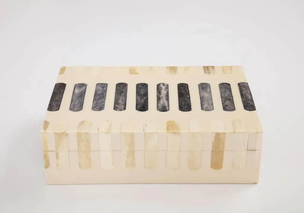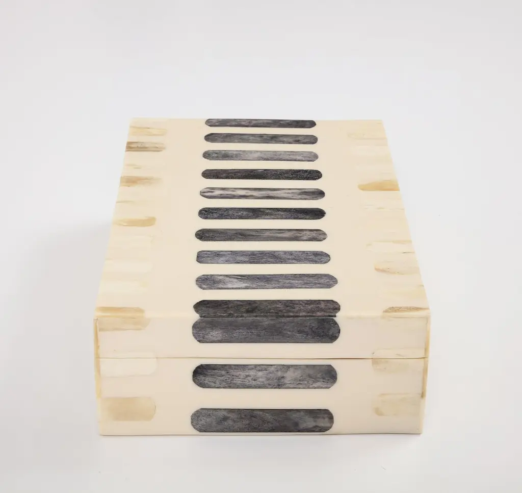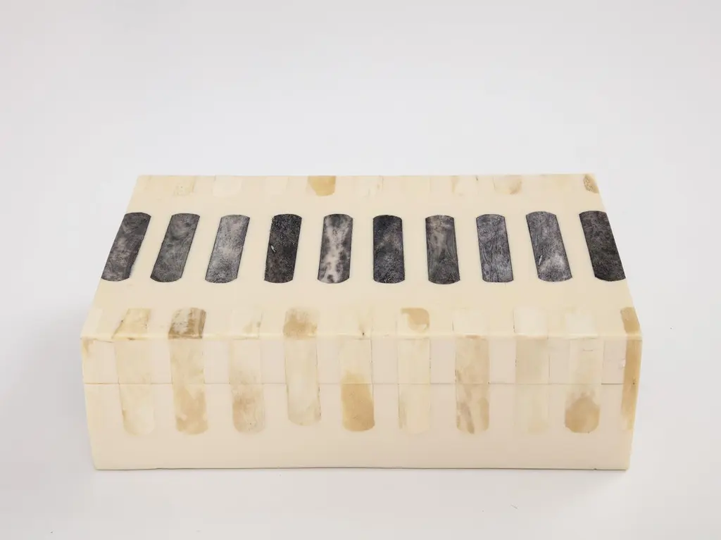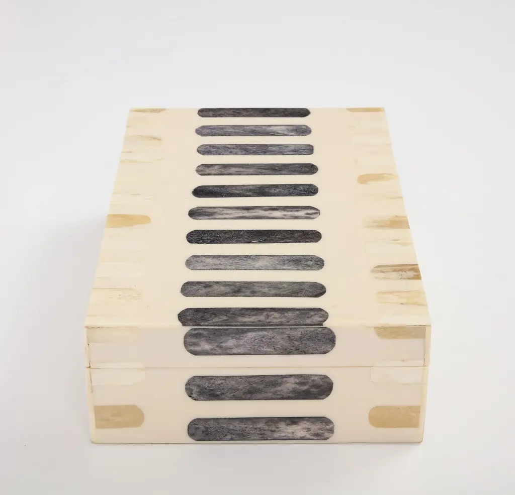 Handmade natural bone box inlaid with grey bone oblong segments, lined in wood. A great storage solution for your desk or coffee table.