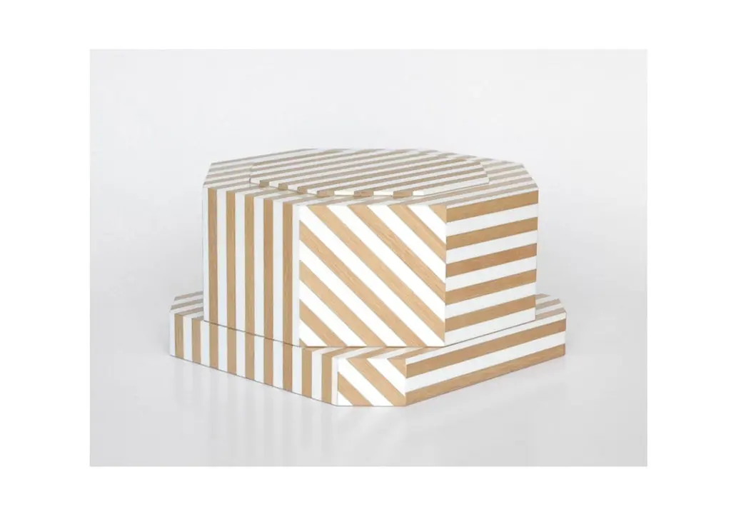 Natural Stripes Ziggurat boxes by OeufficeEdition: 12 + 2AP2012Dimensions: 25 x 25 x 55 cmMaterials: wood box, acrylic, solid stained woodThe Natural Stripes edition is a softer and more restrained version of itsBlack Stripes sibling. The dynamic combination of linear inlay evokesa mood inherent to Optical Art, yet its gentle pairing of natural oak andwhite acrylic finish offers a more refined taste of subtle contrast andsophistication. This Ziggurat is composed of 4 boxes of different sizesthat can be used individually or stacked together to ceate the full iconictower.With the Ziggurat series Oeuffice explores the world of Middle Eastern architecture and ornamental structures. Collaborating with a Lebanese craftsman specialized in wood inlay, Oeuffice has created a system of four independent boxes that stack together forming a monumental tower fitted for the domestic landscape. The form evokes a simplification of traditional Muqarnas found in Middle Eastern architecture, and the inlaid ornamentation provides a new interpretation of scale and an unexpected shift of direction in traditional pattern standards.Oeuffice was founded in 2011 as a collaboration between Nicolas Bellavance-Lecompte and Jakub Zak. After many years of a parallel life between Canada, Berlin and Milan, they united to form Oeuffice, a new research laboratory with a focus on developing innovative objects of limited edition. Their work reflects a common ideal of creating objects inspired by visions of a contemporary utopia and has been exhibited internationally with various galleries including Phillips de Pury in London, R20th in New York, Dimore Gallery in Milan and Carwan Gallery in Beirut.