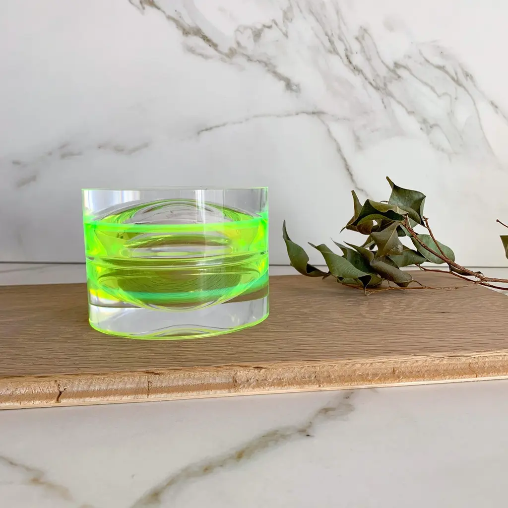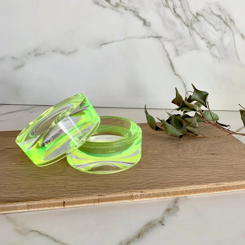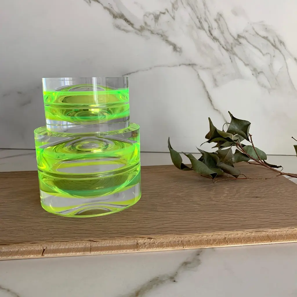 Modern, colorful and fun round box that can be used as a decorative element on a coffee table, desk or nightstand. Serving double duty as a storage box or as a candy bowl. They look beautiful when you pair the two available sizes.Material: Acrylic Designed by Paola Valle and manufactured in Mexico City by extraordinary artisans. Our goal is to work hand by hand to create outstanding pieces that will represent our passion.