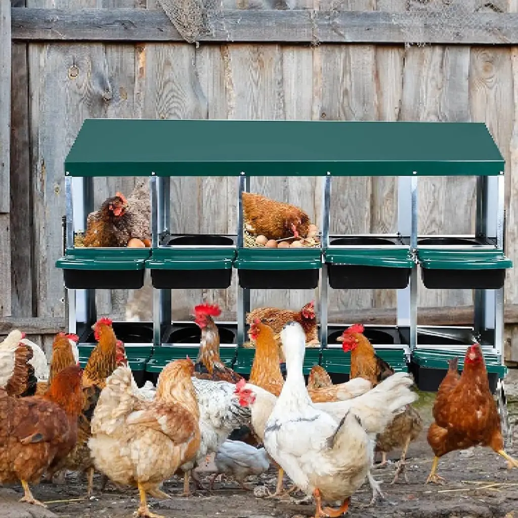 [HAPPY CHICKENS, HAPPY EGGS]Create a nurturing environment for your hens with our thoughtfully designed chicken nesting boxes. These boxes provide a clean and sheltered space for your birds to lay their eggs, ensuring they feel secure and comfortable. With ample room in each nesting box, your hens will experience less stress, leading to increased egg production rates.[INNOVATIVE EGG COLLECTION SYSTEM]Transform your egg collection routine with our chicken nesting box design! Featuring a gentle incline, each box allows freshly laid eggs to roll into a conveniently accessible tray, eliminating the hassle of reaching inside the nesting area. This design not only keeps your precious eggs safe but also streamlines daily farm chores. Say goodbye to messy egg collections and hello to an efficient, hassle-free egg harvesting experience that saves you time[BUILT TO LAST]Durability meets functionality in our chicken nesting boxes, thoughtfully crafted from rugged galvanized steel for the roof and sides. This ensures long-lasting performance, ventilation holes promote airflow, maintaining a cool and dry environment for your hens. The removable trays, constructed from rust-proof plastic, make cleaning and maintenance a breeze. Invest in a robust product that balances strength with comfort, ensuring your hens enjoy a safe and pleasant laying area.[EASY TO CLEAN DESIGN]our nesting boxes for chicken are designed with cleanliness at the forefront. The bottom of each box features numerous small holes that prevent water retention, promoting a dry living space for your hens. Removing the trays for cleaning is effortless—simply take them out, rinse, and replace. This easy-to-clean design ensures your hens have a fresh, hygienic space daily