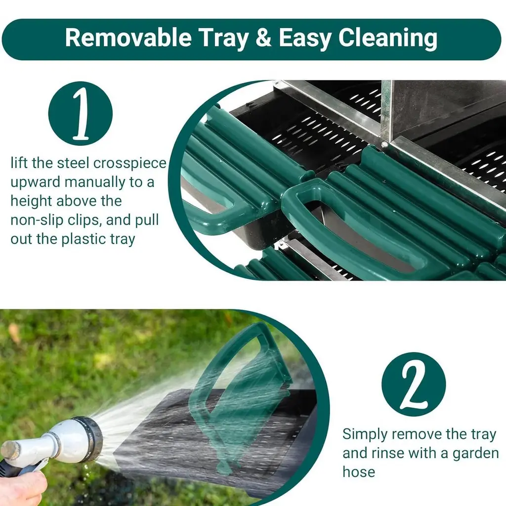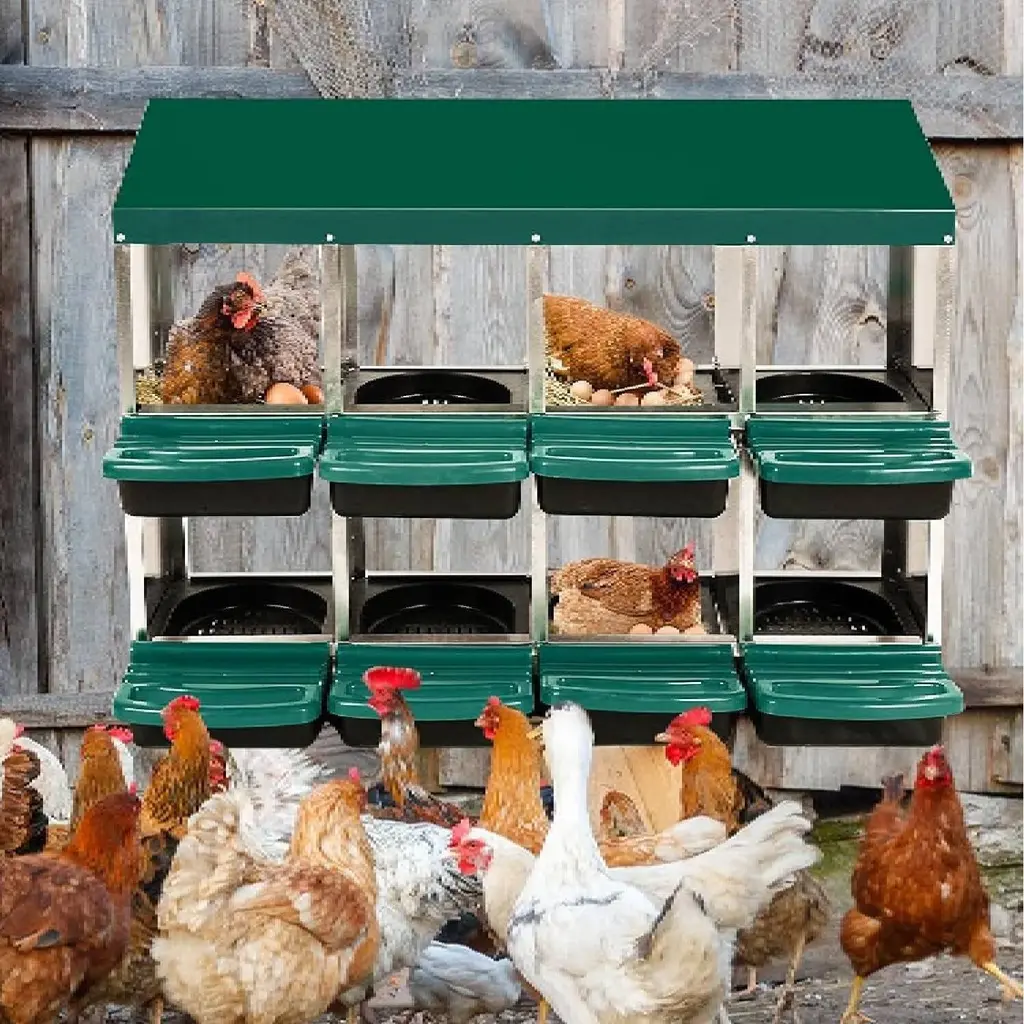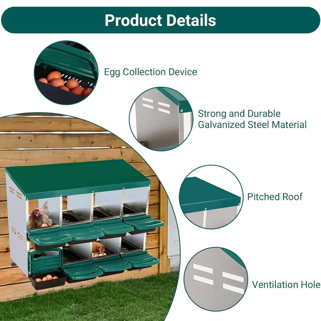 [HAPPY CHICKENS, HAPPY EGGS]Create a nurturing environment for your hens with our thoughtfully designed chicken nesting boxes. These boxes provide a clean and sheltered space for your birds to lay their eggs, ensuring they feel secure and comfortable. With ample room in each nesting box, your hens will experience less stress, leading to increased egg production rates.[INNOVATIVE EGG COLLECTION SYSTEM]Transform your egg collection routine with our chicken nesting box design! Featuring a gentle incline, each box allows freshly laid eggs to roll into a conveniently accessible tray, eliminating the hassle of reaching inside the nesting area. This design not only keeps your precious eggs safe but also streamlines daily farm chores. Say goodbye to messy egg collections and hello to an efficient, hassle-free egg harvesting experience that saves you time[BUILT TO LAST]Durability meets functionality in our chicken nesting boxes, thoughtfully crafted from rugged galvanized steel for the roof and sides. This ensures long-lasting performance, ventilation holes promote airflow, maintaining a cool and dry environment for your hens. The removable trays, constructed from rust-proof plastic, make cleaning and maintenance a breeze. Invest in a robust product that balances strength with comfort, ensuring your hens enjoy a safe and pleasant laying area.[EASY TO CLEAN DESIGN]our nesting boxes for chicken are designed with cleanliness at the forefront. The bottom of each box features numerous small holes that prevent water retention, promoting a dry living space for your hens. Removing the trays for cleaning is effortless—simply take them out, rinse, and replace. This easy-to-clean design ensures your hens have a fresh, hygienic space daily
