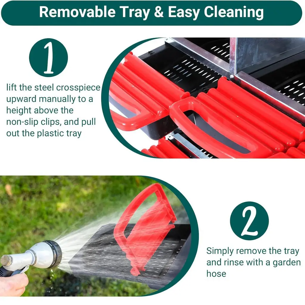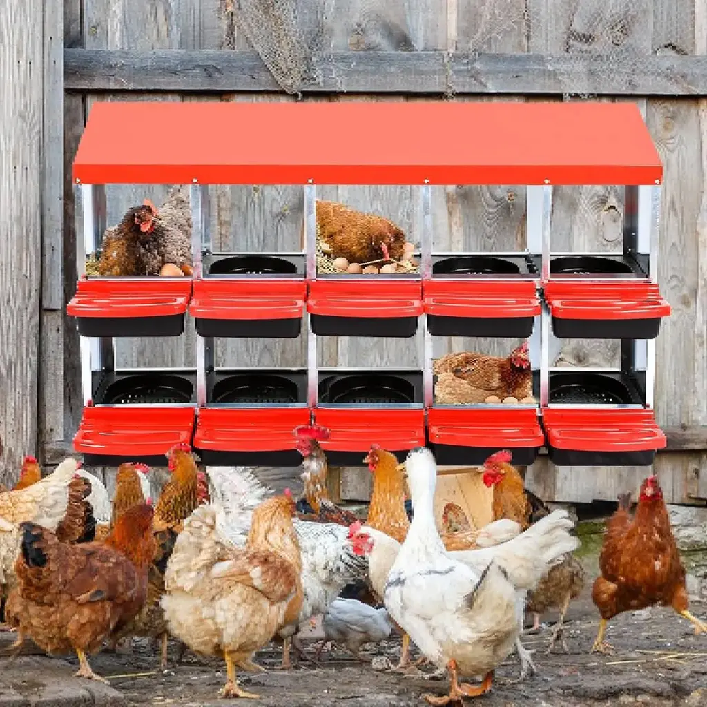 [HAPPY CHICKENS, HAPPY EGGS]Create a nurturing environment for your hens with our thoughtfully designed chicken nesting boxes. These boxes provide a clean and sheltered space for your birds to lay their eggs, ensuring they feel secure and comfortable. With ample room in each nesting box, your hens will experience less stress, leading to increased egg production rates.[INNOVATIVE EGG COLLECTION SYSTEM]Transform your egg collection routine with our chicken nesting box design! Featuring a gentle incline, each box allows freshly laid eggs to roll into a conveniently accessible tray, eliminating the hassle of reaching inside the nesting area. This design not only keeps your precious eggs safe but also streamlines daily farm chores. Say goodbye to messy egg collections and hello to an efficient, hassle-free egg harvesting experience that saves you time[BUILT TO LAST]Durability meets functionality in our chicken nesting boxes, thoughtfully crafted from rugged galvanized steel for the roof and sides. This ensures long-lasting performance, ventilation holes promote airflow, maintaining a cool and dry environment for your hens. The removable trays, constructed from rust-proof plastic, make cleaning and maintenance a breeze. Invest in a robust product that balances strength with comfort, ensuring your hens enjoy a safe and pleasant laying area.[EASY TO CLEAN DESIGN]our nesting boxes for chicken are designed with cleanliness at the forefront. The bottom of each box features numerous small holes that prevent water retention, promoting a dry living space for your hens. Removing the trays for cleaning is effortless—simply take them out, rinse, and replace. This easy-to-clean design ensures your hens have a fresh, hygienic space daily