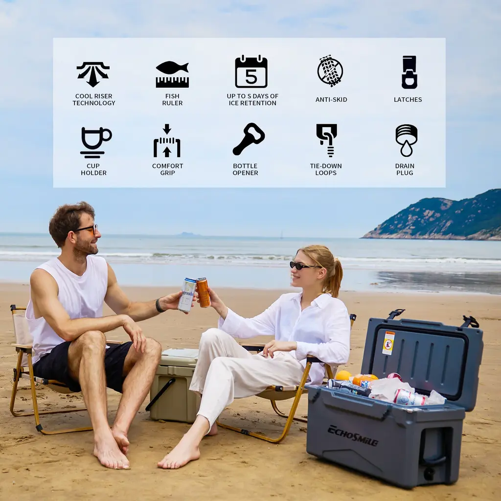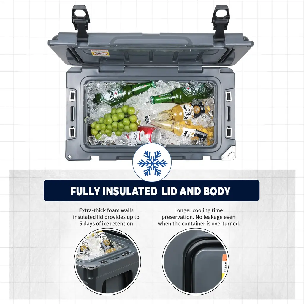 This rugged insulated box, rugged rotary mold freezer and cooler with a classic surface color and natural gloss, using LLDPE material, is safe and environmentally friendly, strong and wear-resistant, inside (food grade) and outside (UV resistant). Coolers are sized and designed to meet different needs, whether you need a small personal cooler or a large high capacity cooler, we can meet your needs. It will be the perfect tool to cool your drinks such as beer, soft drinks, soft drinks and juices, and has amazing load-bearing power, completely supporting you to sit or stand on the lid without worrying about it breaking.