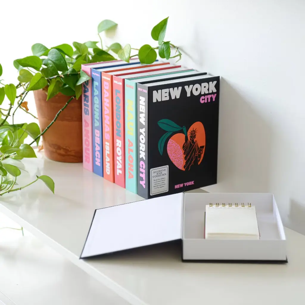 The Magnetic Storage Book Boxes are more than just stylish storage solutions—they’re a celebration of the world’s most awe-inspiring travel destinations. Each box is adorned with beautiful cover art that captures the essence of iconic places, from the romantic streets of Paris to the golden beaches, the vibrant night life of New York or the forested mountains and endless sunshine of Maui. These destinations come to life with bright designs that evoke the spirit of adventure, curiosity, and the thrill of exploration.Our magnetic storage boxes are more than just decorative; they are designed with practicality in mind, perfect for storing everything from keepsakes to small treasures, documents, and even office supplies. Thanks to their discreet yet sophisticated design, these boxes offer the perfect balance between functionality and beauty and are a wonderful addition to any bookshelf.