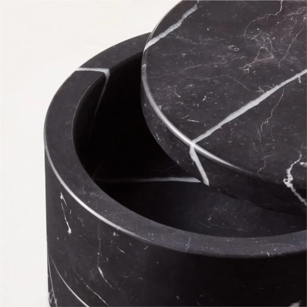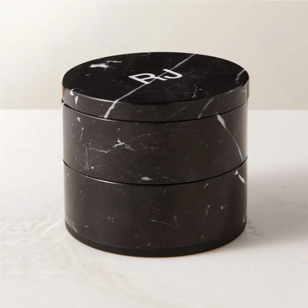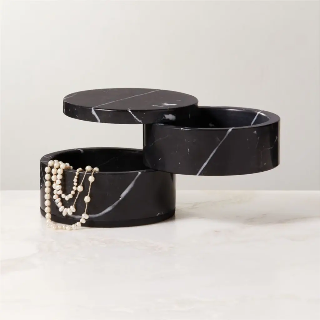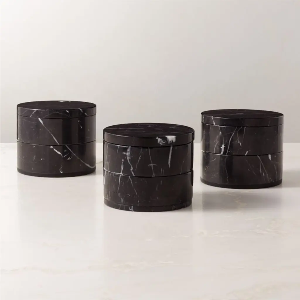 Rich Marquina black marble box with striking white veining makes a sleek hideaway for jewelry. Two tiers of marble are stacked to keep things organized. Pair with the full Nexus black marble bath collection for a coordinated look. CB2 exclusive.