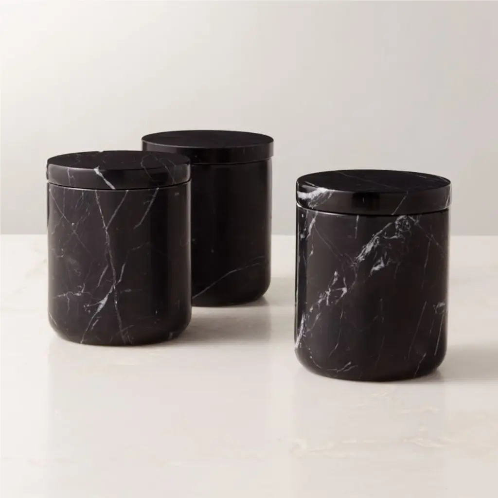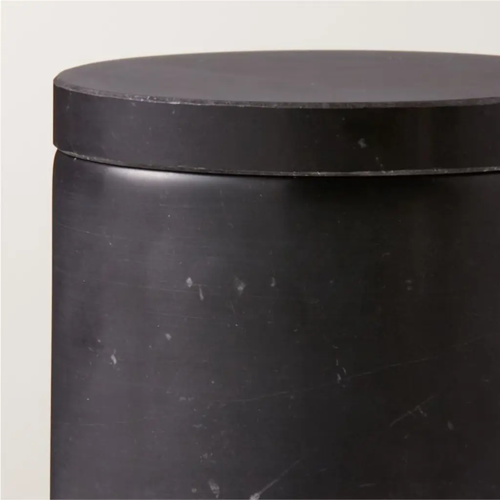 Rich black marble canister with striking white veining makes a sleek hideaway for bathroom supplies. Coordinate with the full black marble bath collection for an extra chic look. CB2 exclusive.