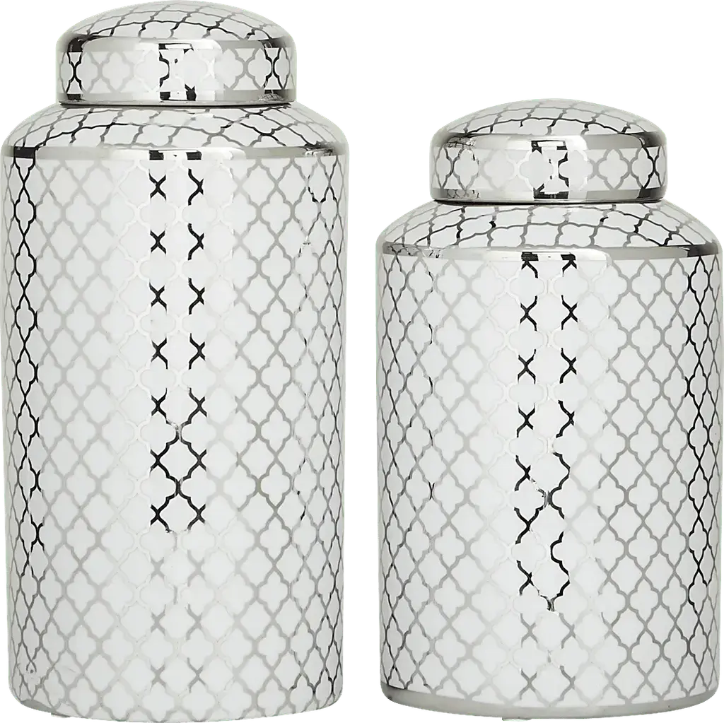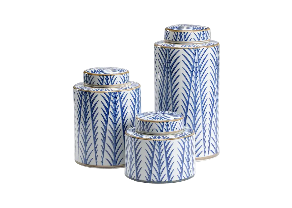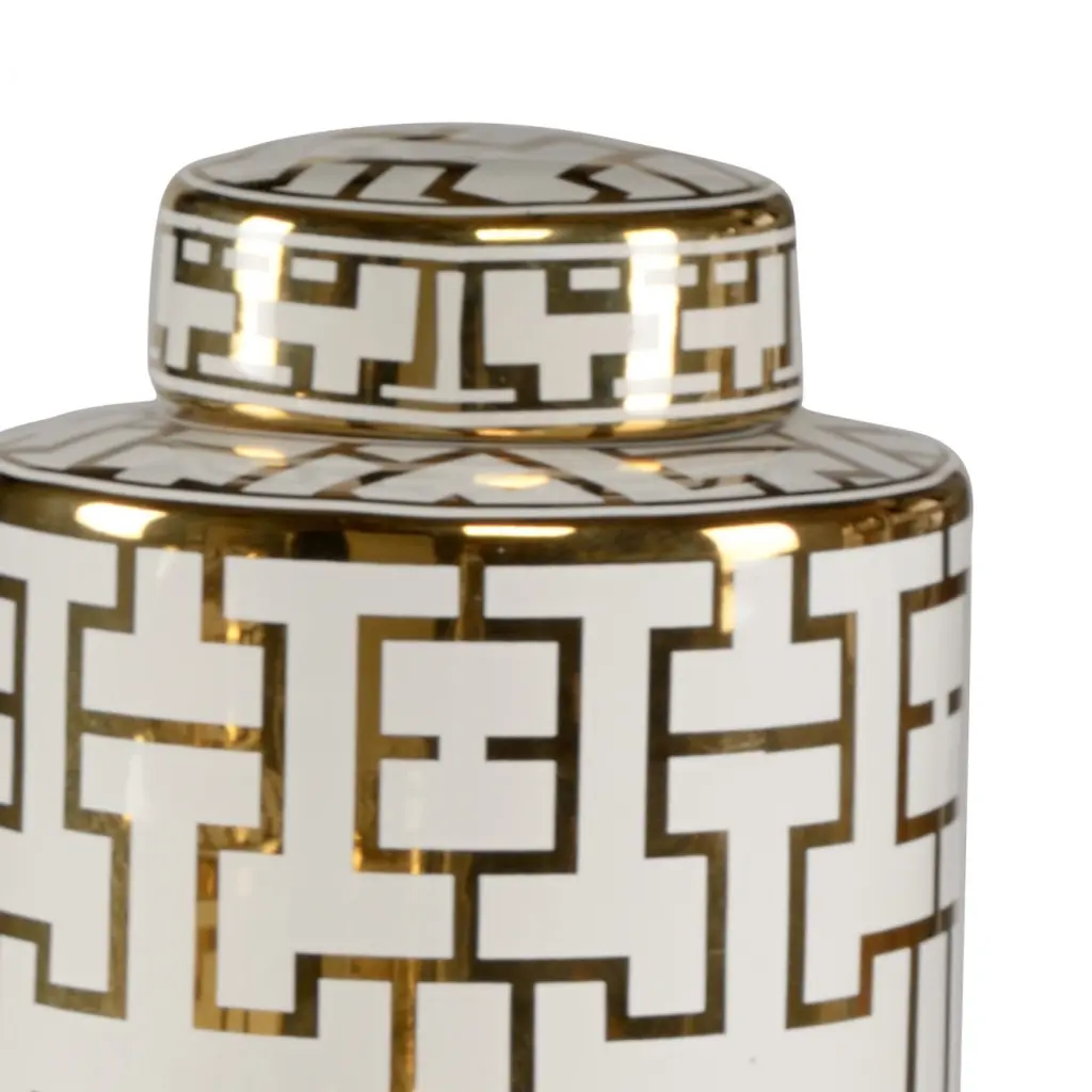 Set Of Three Porcleian Canisters With Metallic Gold And White Geometric Pattern Small-10.5 in. h 7 in. w 7 in. d Med- 13 in. h 7 in. w 7 in. d Large-16 in. h 7 in. w 7 in. d