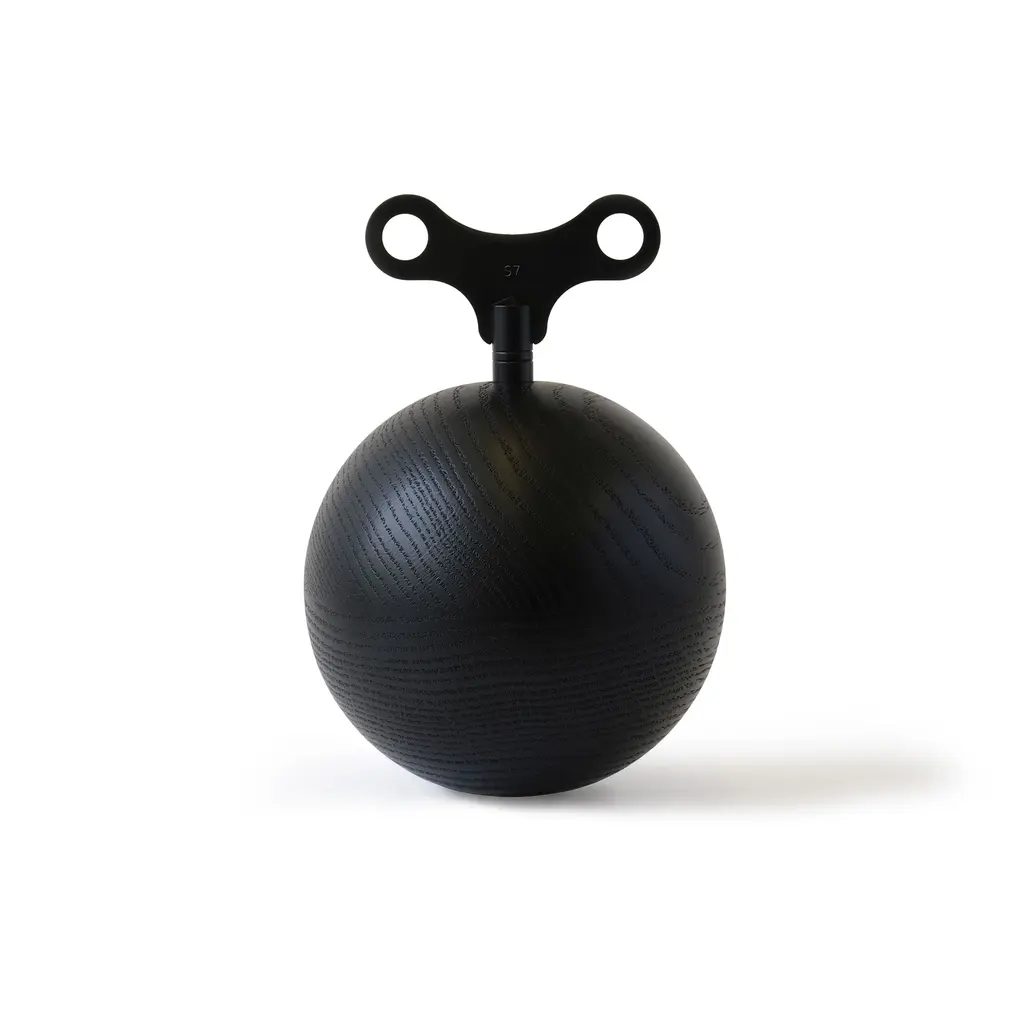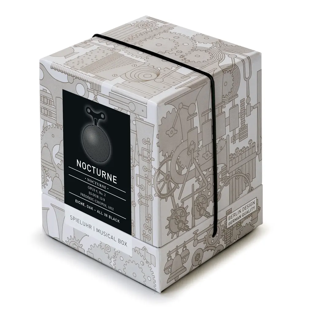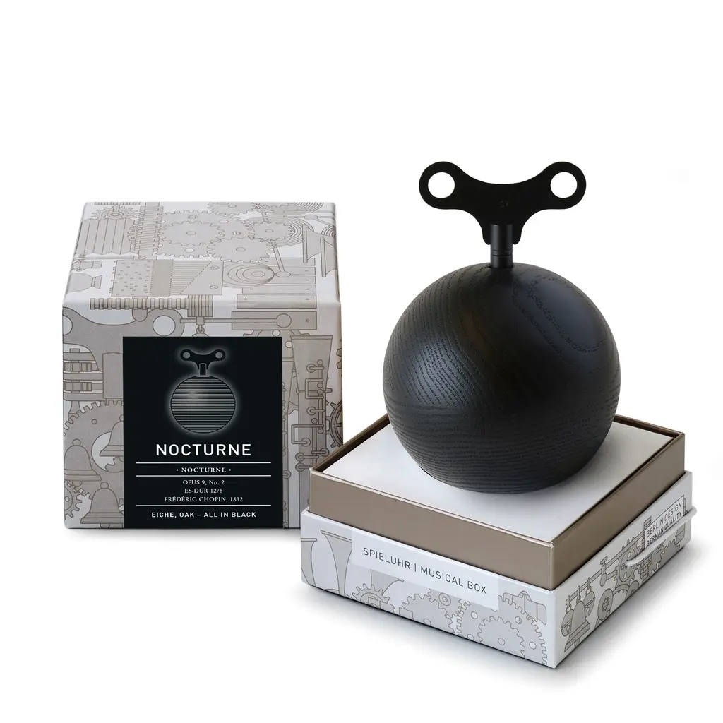 ‘Going to be night’ is the literal translation of the Nocturne – a form of music that was already popular in the Baroque. The ‘21 Nocturnes’ of the romantic composer Frédéric Chopin has brought the nocturnal theme to perfection. His gracefully melancholic piano pieces instantly found an enthusiastic audience. For our monochrome black NOCTURNE we have selected his most popular night piece ‘Nocturne Opus 9’. In the Black Forest, the mechanical 18-note chime is inserted into blocks of solid oak wood, then turned and covered with open-pored silk matt lacquer. Inside the perfect sphere sounds Chopin’s masterpiece.