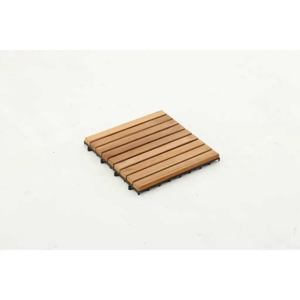 Renovate your patio with this stylish set of classic teak wood interlocking tiles. Nine slats of teak wood run across the surface of each square tile, creating a simple design for a uniform or patterned look. The non-slip finish of these tiles lends a modern touch to indoor and outdoor spaces alike.Features: