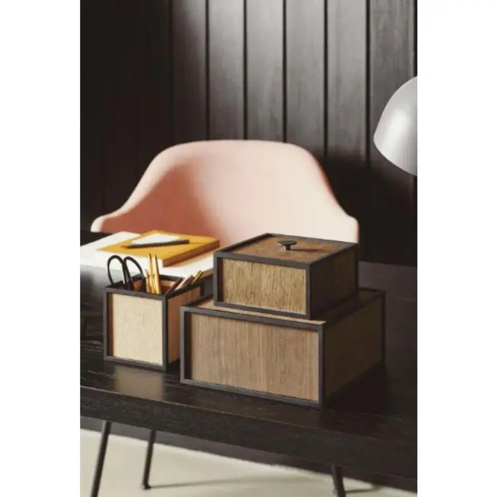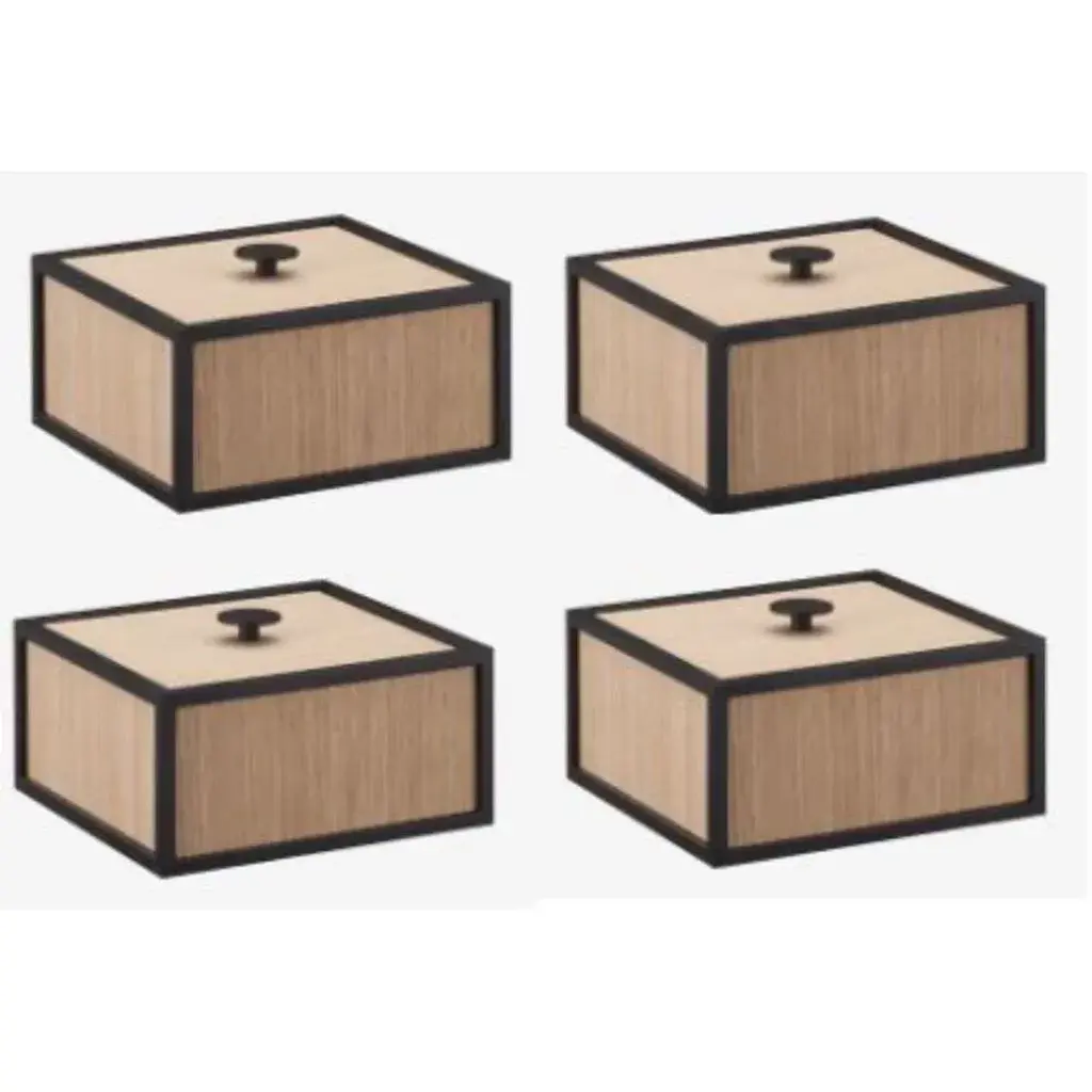 Set of 4 oak frame 14 box by Lassen Dimensions: d 10 x w 10 x h 7 cm Materials: Finér, Melamin, Melamine, Metal, Veneer Weight: 1.10 Kg Frame Box is a square box in a cubistic shape. The simple boxes are inspired by the Kubus candleholder by Mogens Lassen, that are based on strict mathematical formulas and designed with the greatest precision.