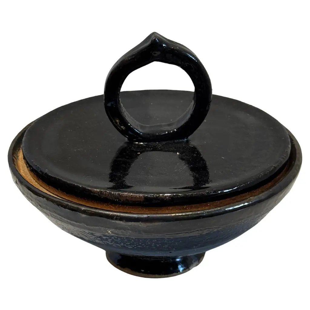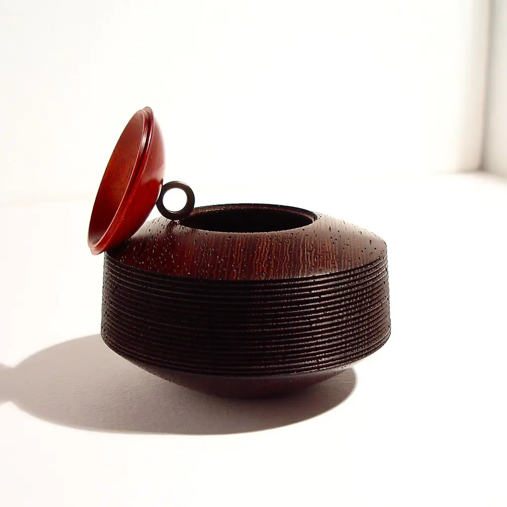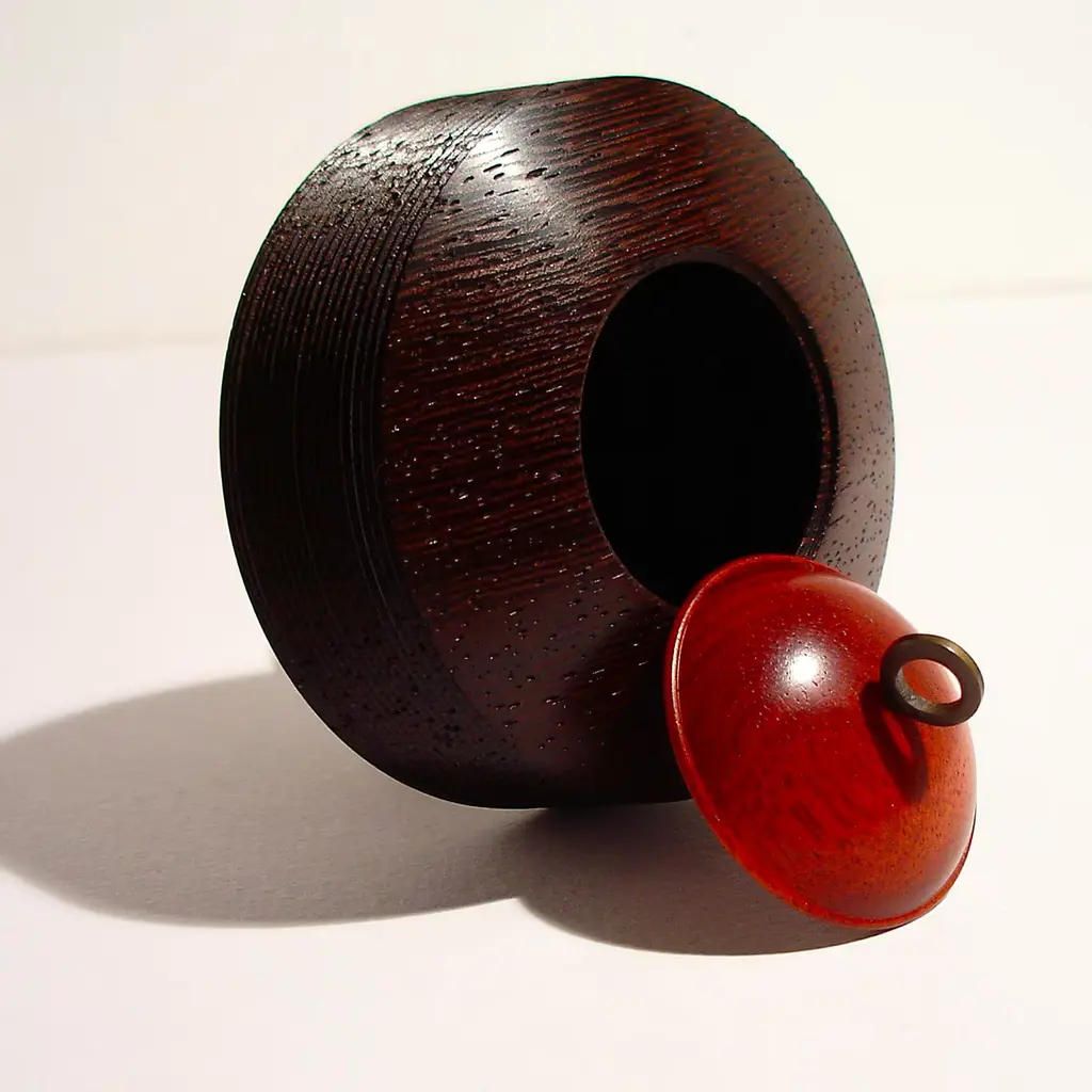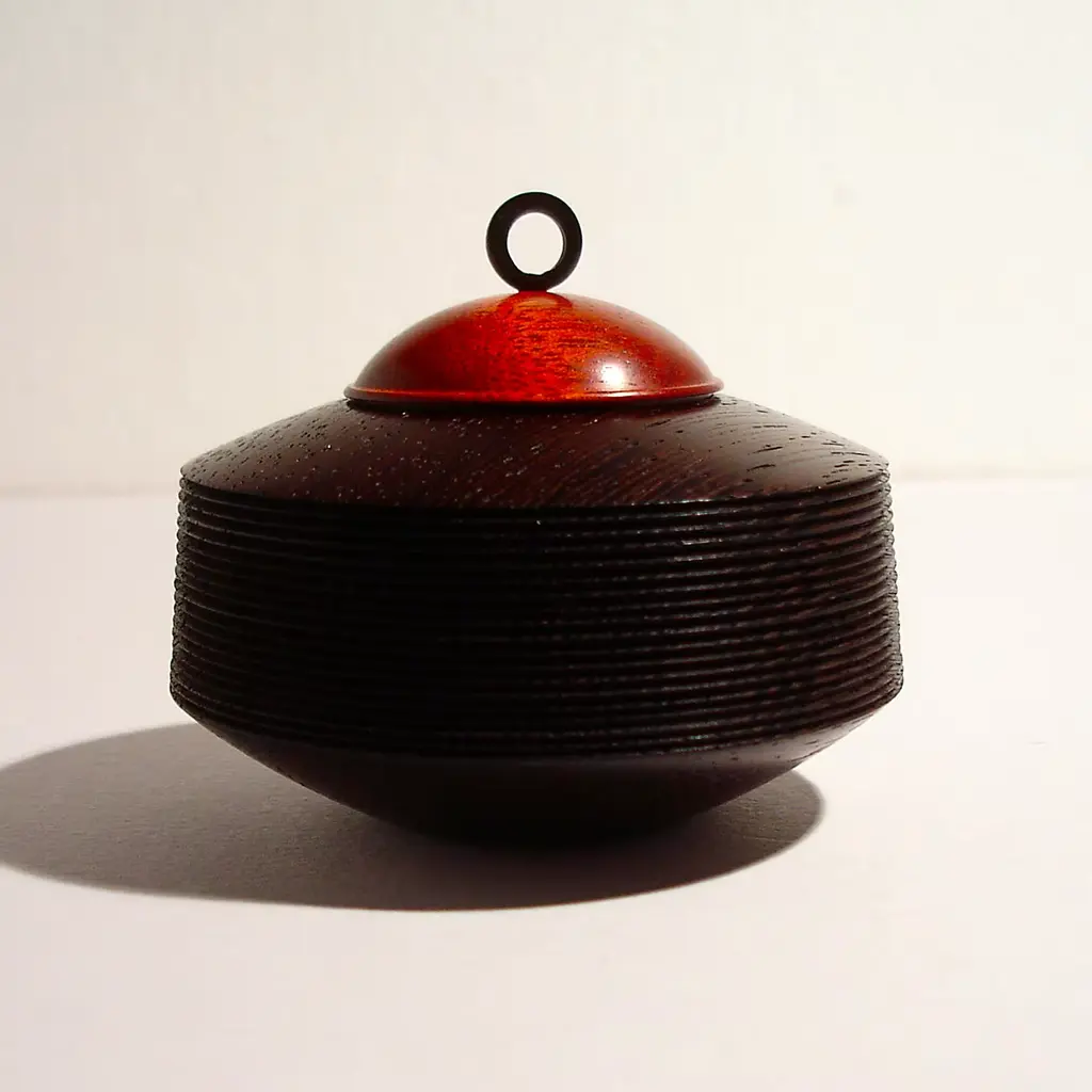 This small and lightweight box with lid is part of the Obox Collection characterized by simple shapes crafted by hand of prized woods with a distinctive ring knob in etched brass. A sophisticated addition to a personal collection and the perfect choice for any gift-giving occasion, this box features a tall, circular wengè base with delicate, horizontal ridges and a small dome-shaped lid of Muirapiranga boasting a stunning orange hue.