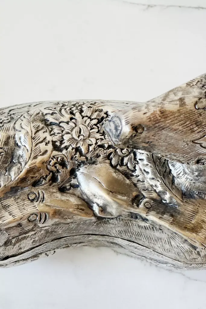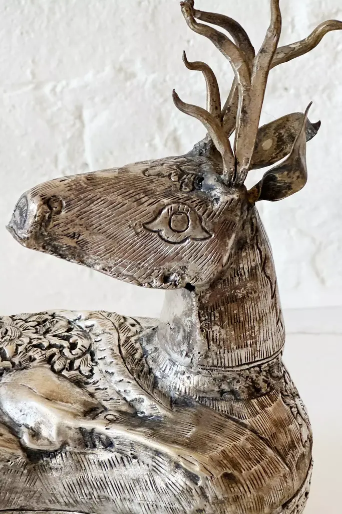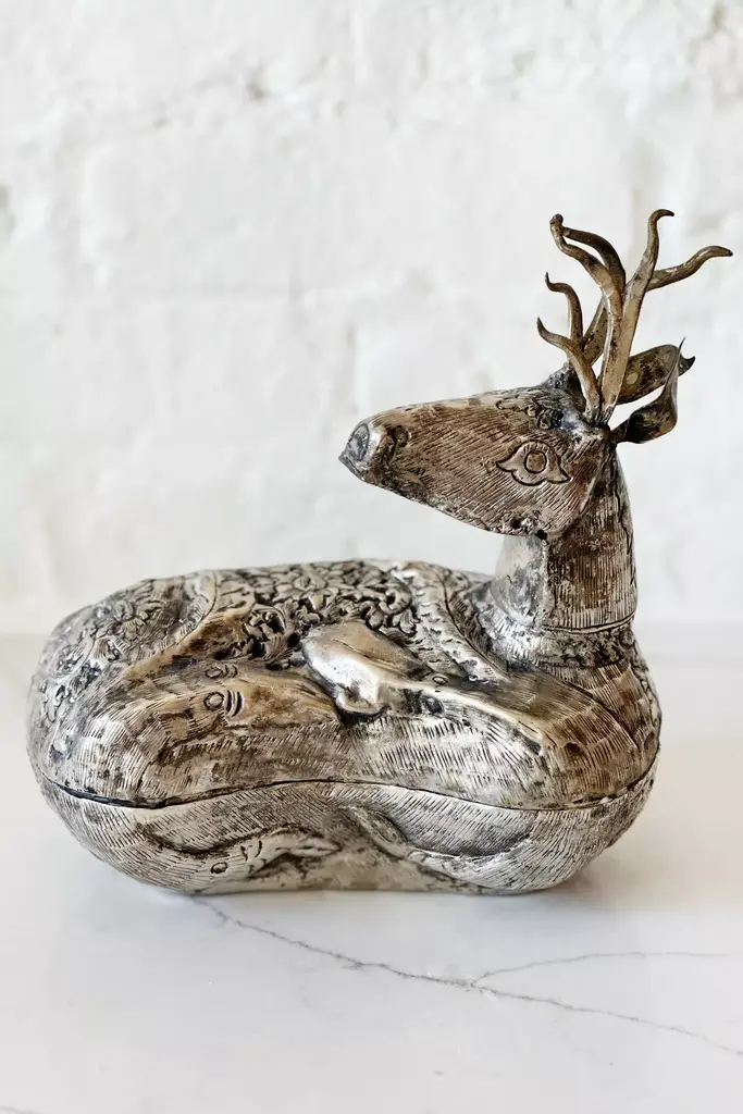 **Please note all sales are final**This amazing reindeer shaped Betel Nut box is a rare collectors piece, a stunning example of vintage craftsmanship, and an incredibly unique design.Betel Nut boxes were a highly prized possession in traditional Cambodian society. The practice of betel nut chewing was proffered in hospitality and the boxes contained the ceremonial components. Acquiring them can be a challenge since they have become rare antiques; therefore, they are extremely valuable.About Old Flame Candle Co. for Anthropologie:VINTAGE VESSELS. MODERN SCENTS. NATURAL WAX.Old Flame Candle Co. originated with hand-picked, uniquely vintage vessels that were transformed into chic candles for the design-savvy buyer. Old Flame has blossomed beyond just candles, yet remains true to our vintage roots.* Vintage Rare 1900s Etched Silver Reindeer Betel Nut Box* Due to the authentic vintage nature of each carefully selected piece, they may be adorned with subtle markings, tarnish, patina, scratches, and/or verdigris, only lending to their character and beauty; no cracks or chips should ever be visible, unless noted in listing* Hand wash #### *Dimensions** 8" long x 4.5" wide x 9" tall