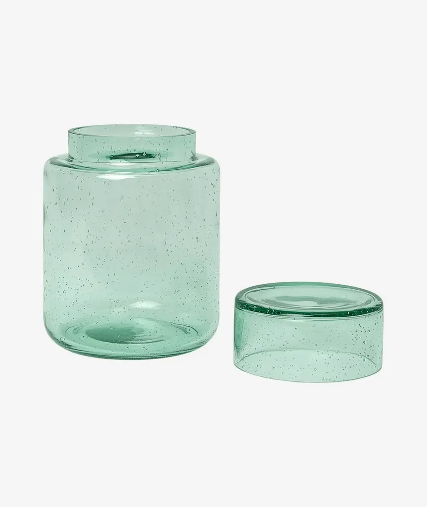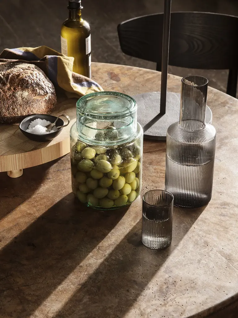 Inspired by vintage olive jars, the Oli Container is a multifunctional glass container that can be used both as a storage container and as a vase. Made from 100% recycled glass, the versatile container features distinctive little bubbles that are created by deliberate pockets of air left between the layers of mouth-blown glass. When not in use with the container, the generously sized lid can double as a serving tray. Both decorative and practical, the Oli Container is ideal for open-storage kitchens.