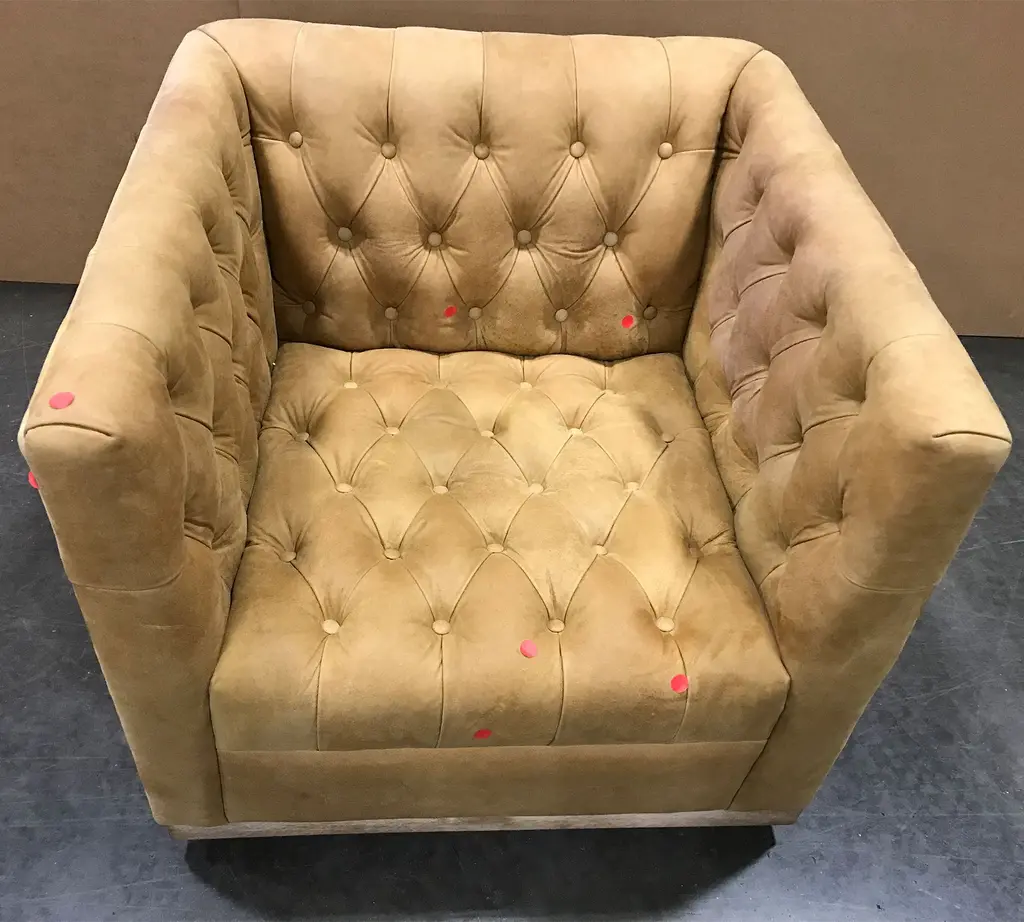 Tufted and well-tailored, Edgewood’s slim silhouette offers a fresh take on the traditional Chesterfield. We updated that classic look with a sheltering profile and a swivel design. Its floating wooden base gives it warmth, along with leather upholstery that will soften and develop a unique patina with time and use.