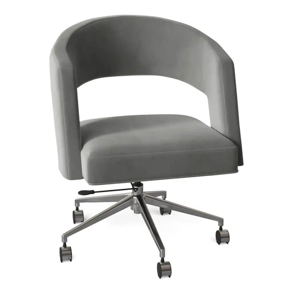 A softly rounded back and sloping arms give this desk chair a supportive, sheltering feel. The base rotates 360 degrees for maneuverable comfort from every angle. Even better, the leather means the more you use it, the more beautiful it becomes.