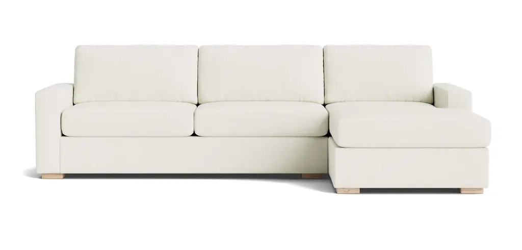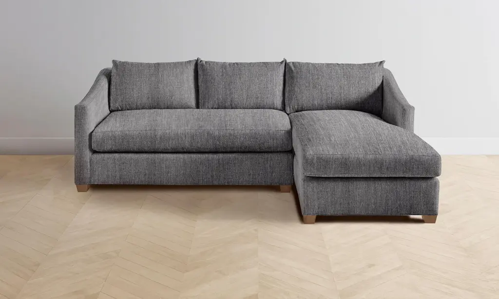 Neat tailored details make a classic statement. Slim and streamlined frame hand built in the USA. All wood is kiln-dried for added durability. Reversible chaise makes room rearranging easy.
