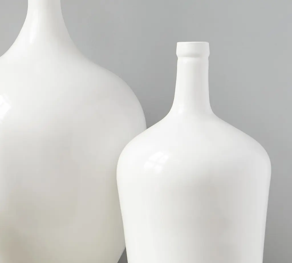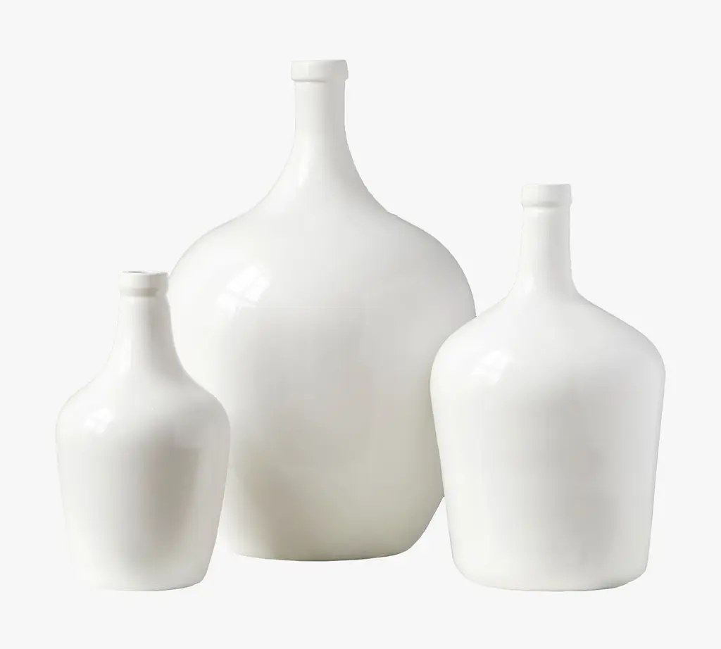 These handblown decorative bottles owe their shape to the vessels once used to transport and store wine. Made in Europe of recycled glass, their high-gloss finish puts a modern spin on a timeless classic. Display individually or group assorted sizes for an artful arrangement.