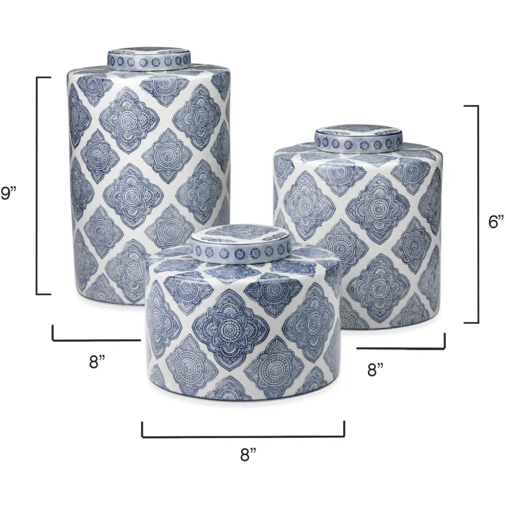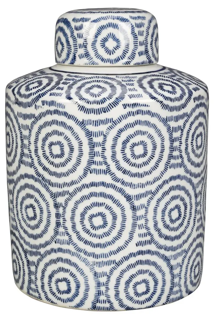 This cannister is a simple contemporary column shape in a sophisticated Arabic indigo pattern, repeated over a bone white porcelain background.