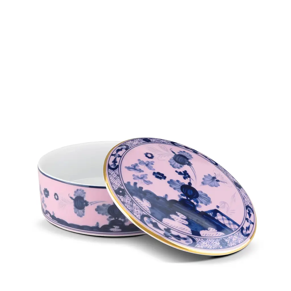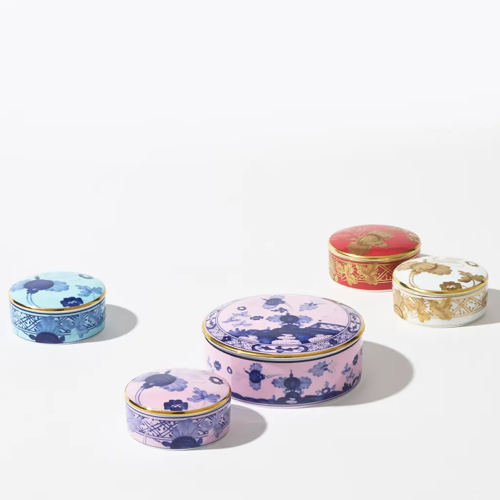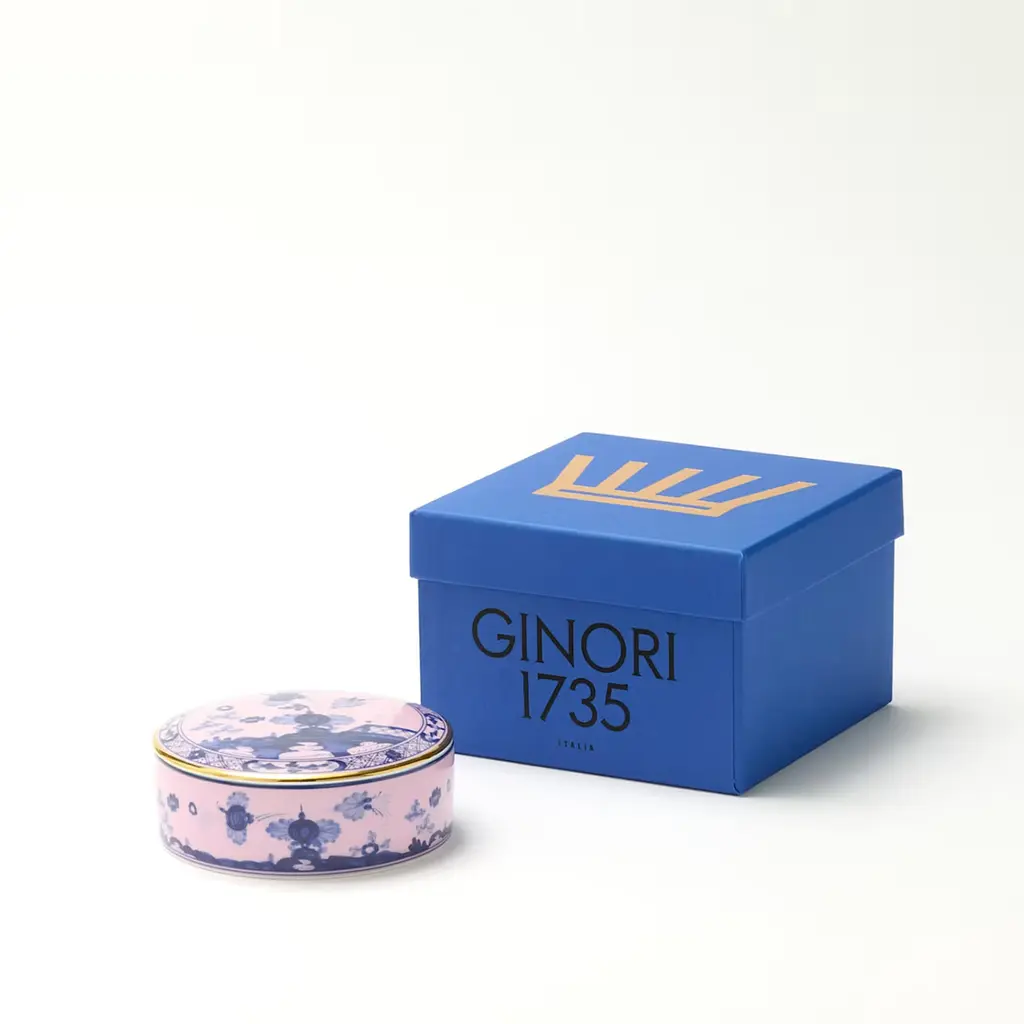 The large porcelain trinket box in the Azalea pattern with gold trim from the Oriente Italiano Collection features a delicate floral motif in blue, highlighted by distinctive gold accents against a soft pink background. Showcasing Ginori 1735’s signature craftsmanship, this elegant piece complements tableware, tea and coffee sets, and room diffusers. A refined addition to any décor, the collection transforms each porcelain element into a timeless work of art, perfect for elevating any occasion.