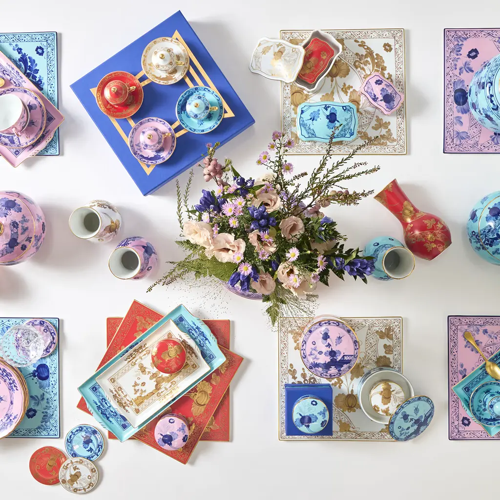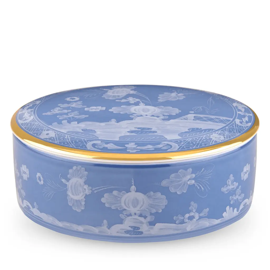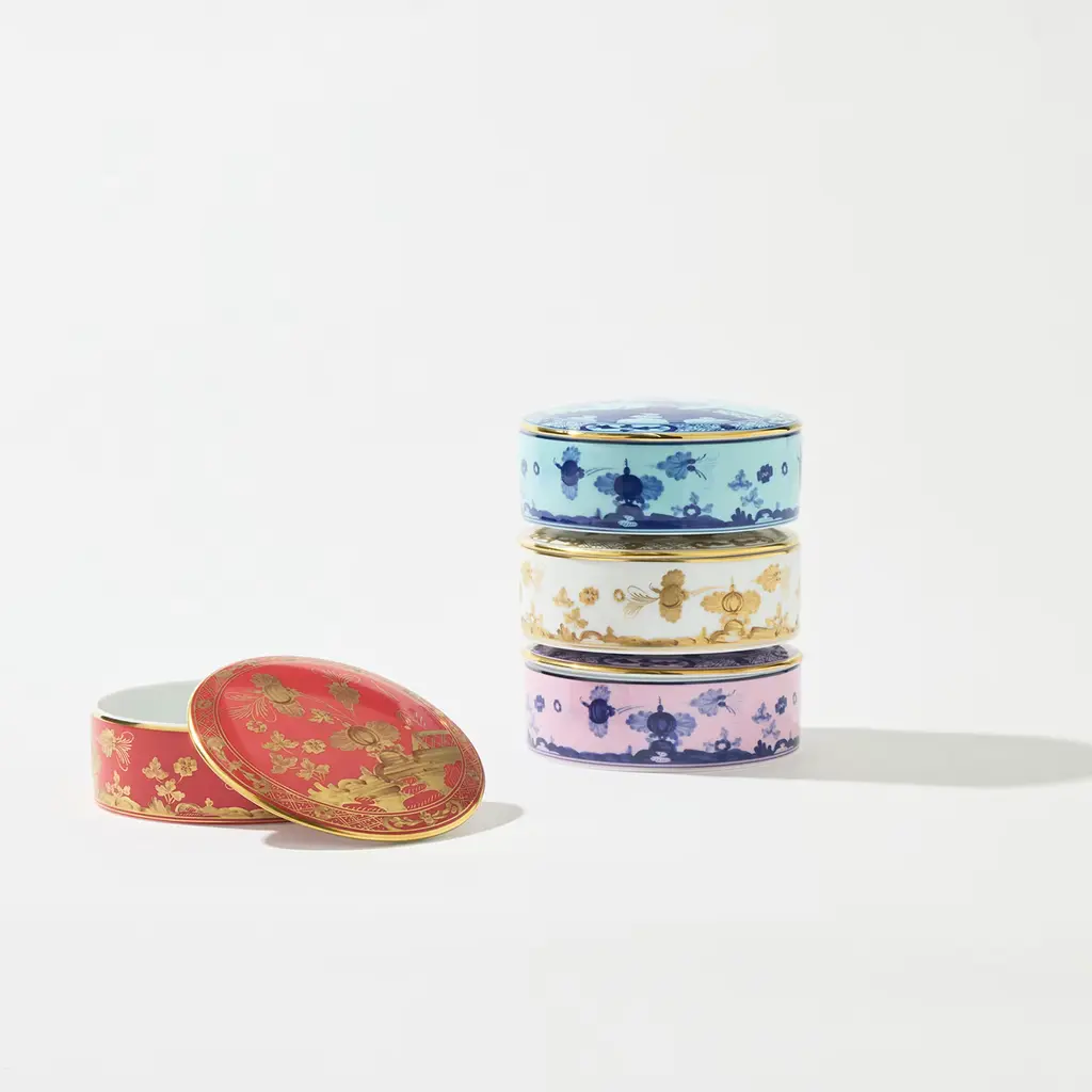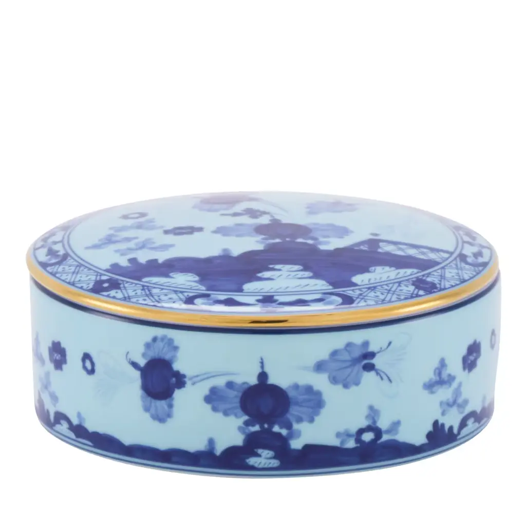 The large porcelain trinket box in the Azalea pattern with gold trim from the Oriente Italiano Collection features a delicate floral motif in blue, highlighted by distinctive gold accents against a soft pink background. Showcasing Ginori 1735’s signature craftsmanship, this elegant piece complements tableware, tea and coffee sets, and room diffusers. A refined addition to any décor, the collection transforms each porcelain element into a timeless work of art, perfect for elevating any occasion.