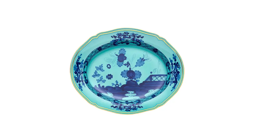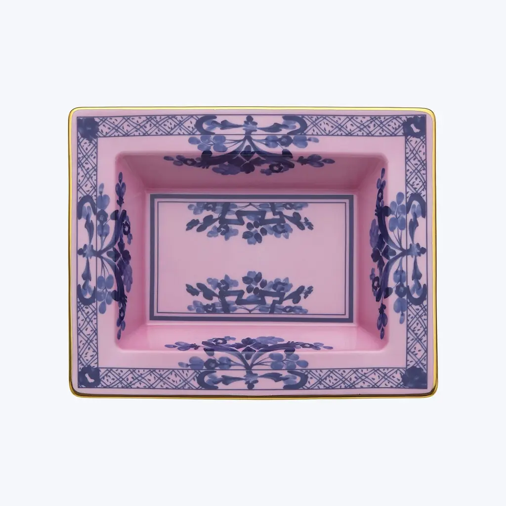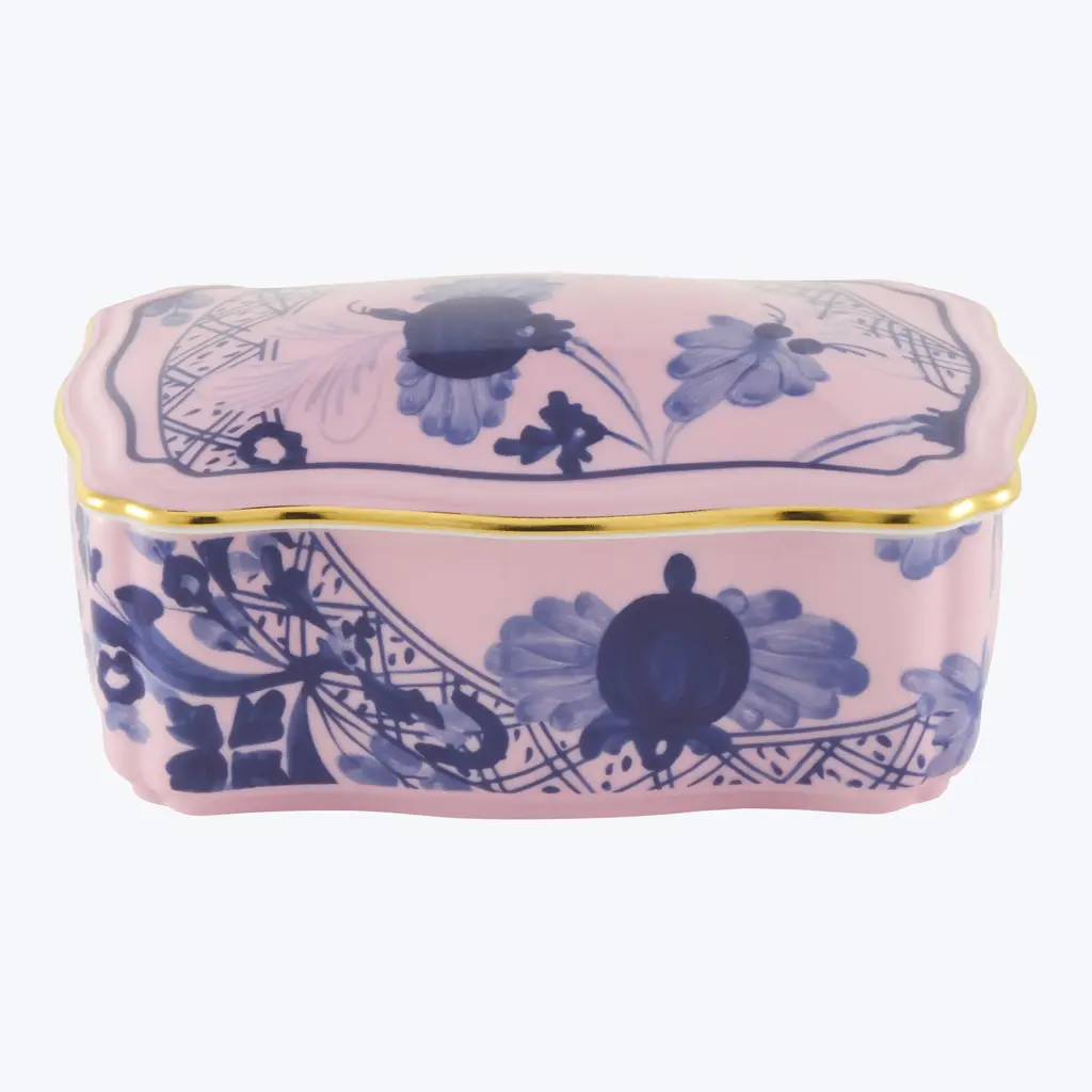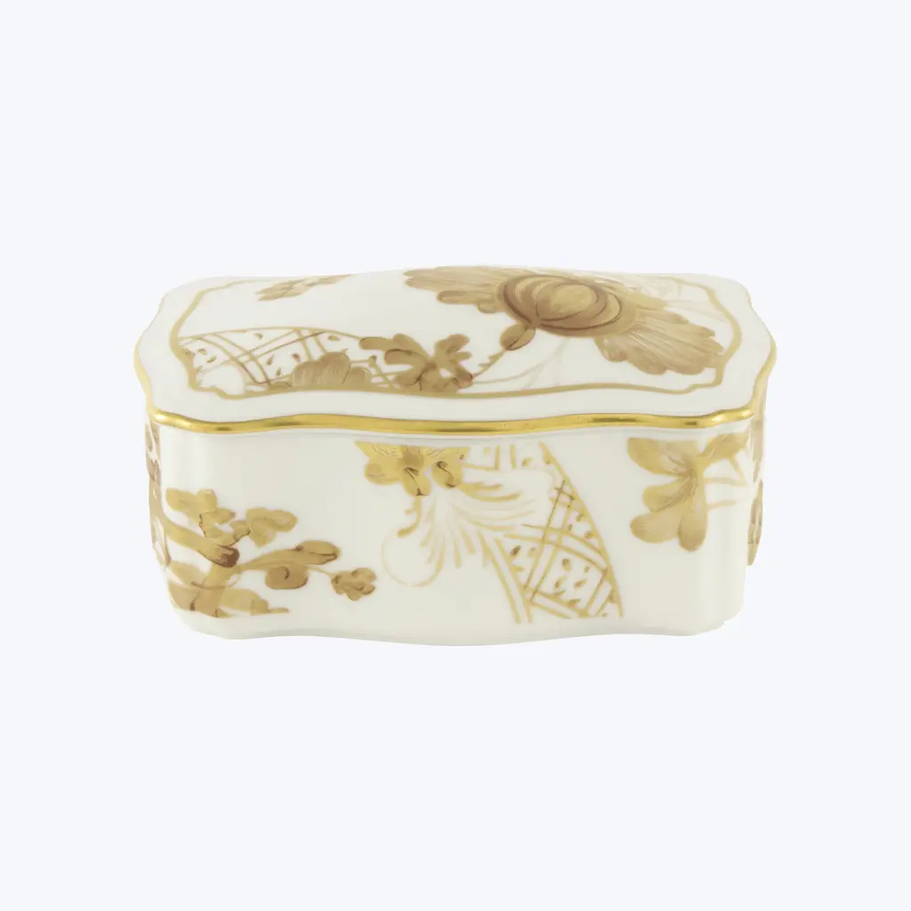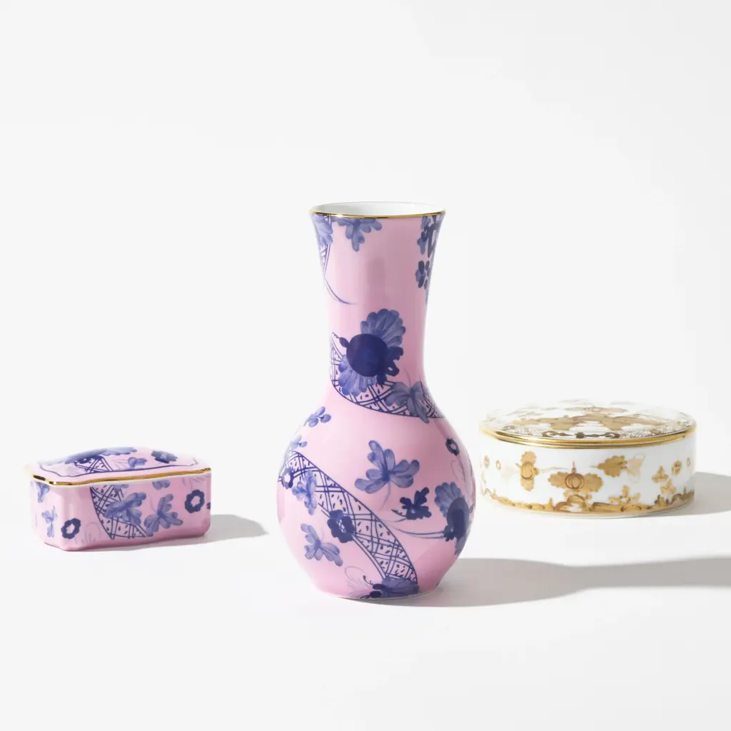 The Oriente Italiano Small Trinket Box by Ginori 1735 is a luxurious decorative piece from the renowned Italian tableware maker. Crafted in fine porcelain, this exquisite trinket box is hand-painted with a delicate gold edge. Perfect for storing rings and other fine jewelry. Available in shades of Aurum, Azalea, and Iris.