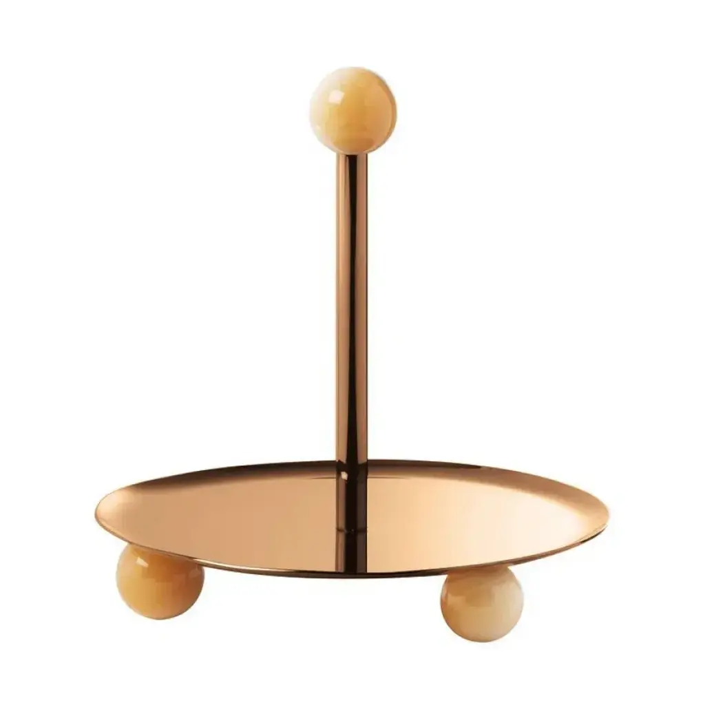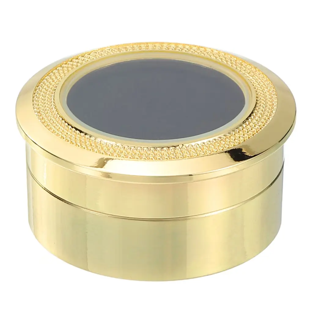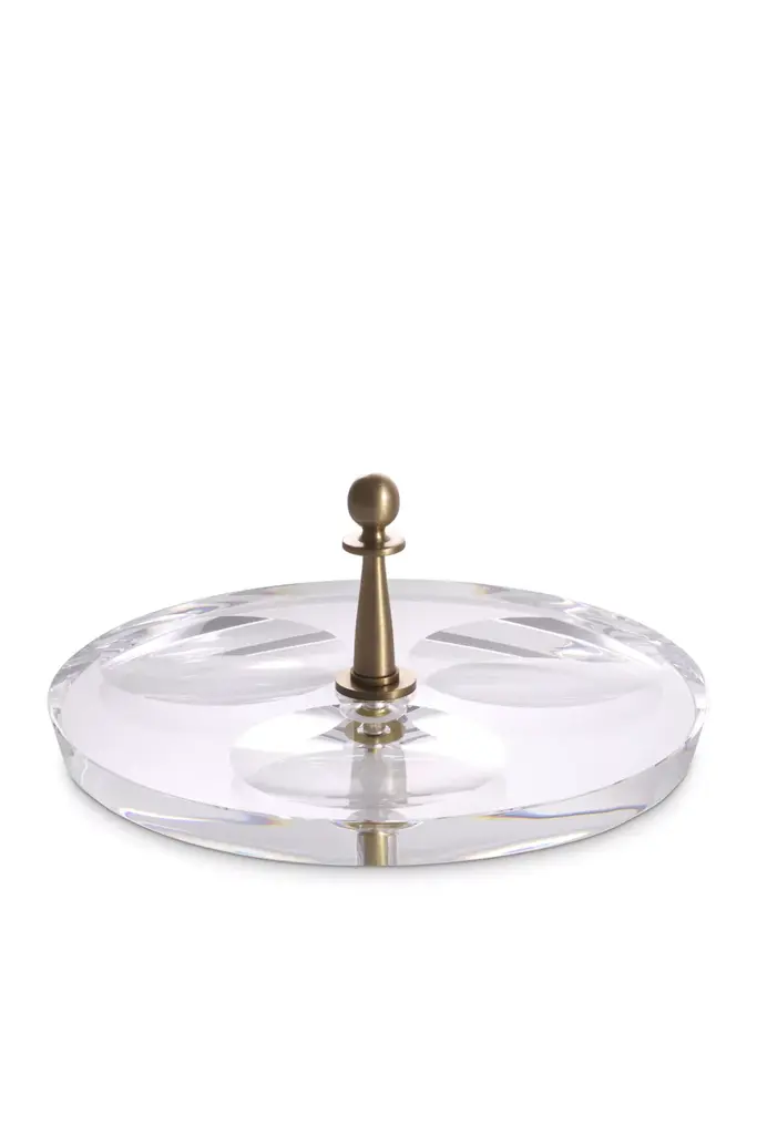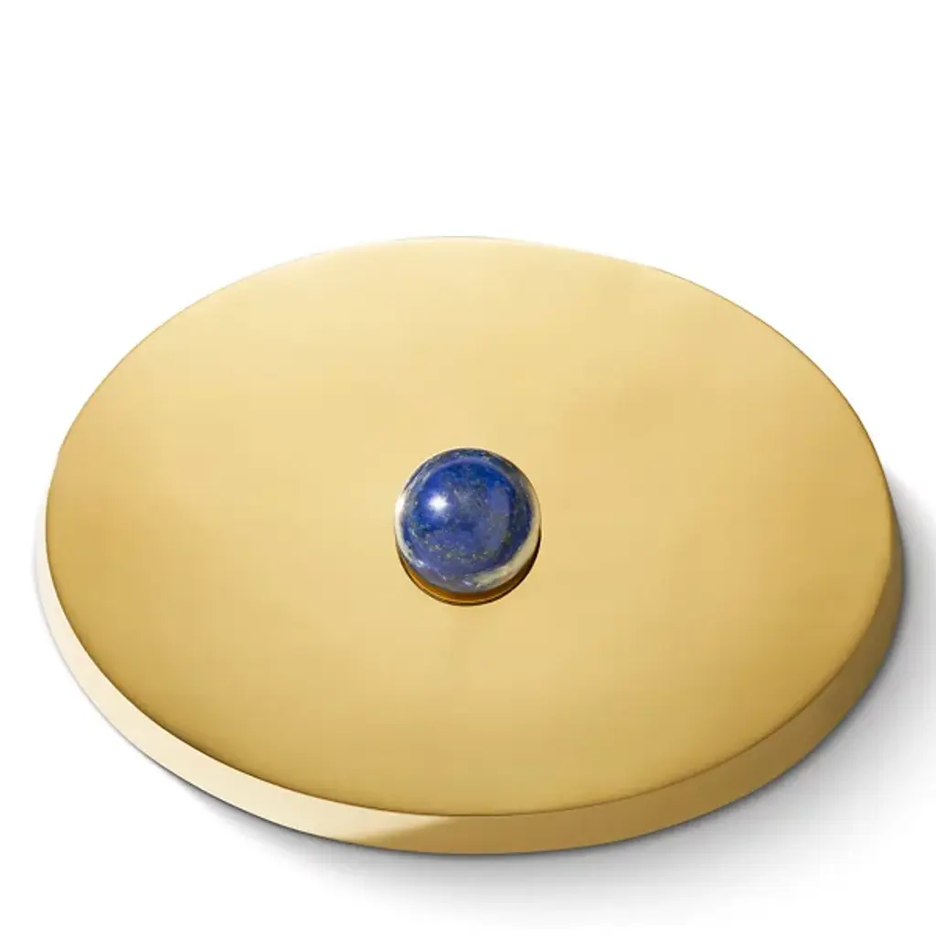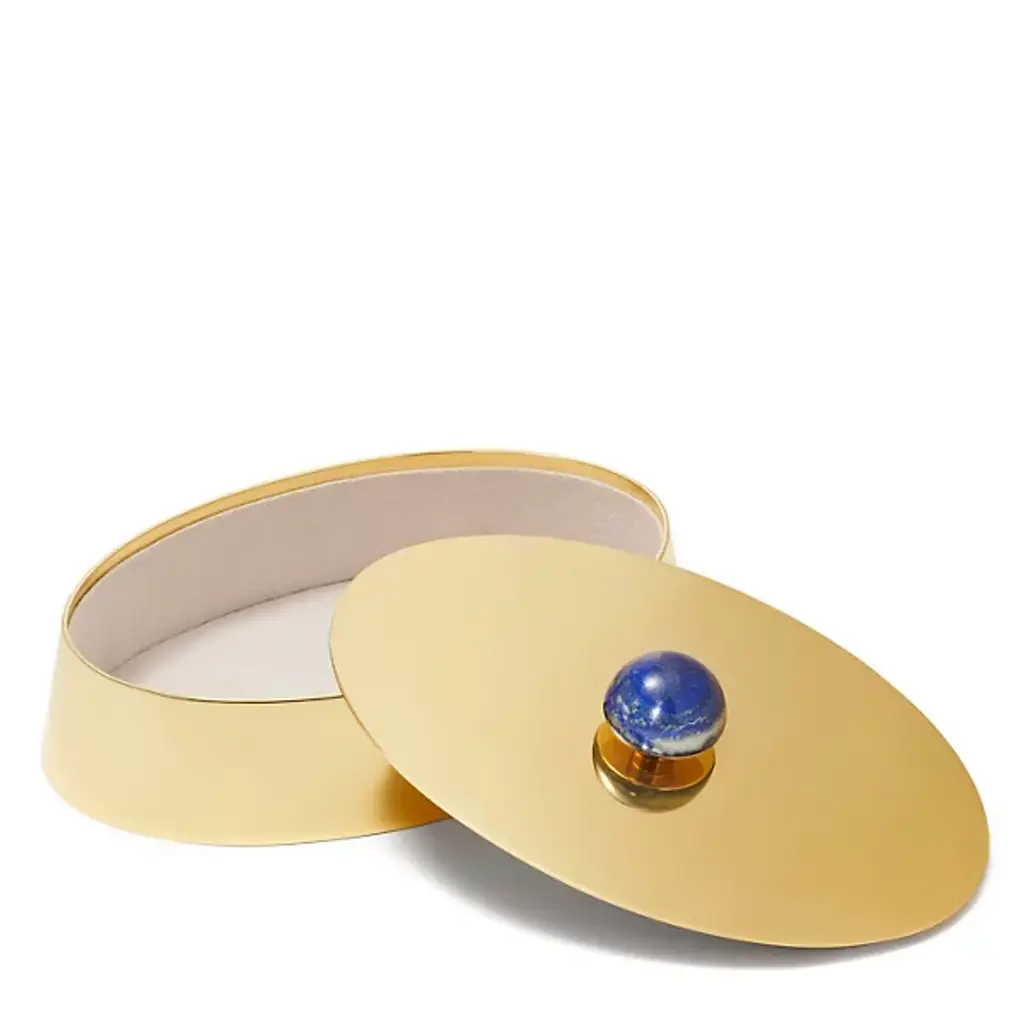 The Ornella Decorative Box from AERIN features a circular brass construction with a tapered base that gives it a striking profile when viewed from the side. The overhanging lid creates visual interest, while the domed lapis gemstone handle draws inspiration from European mosaic traditions. Each lapis stone displays unique patterns and depth that make every box one-of-a-kind. The suede lining protects jewelry and small items from scratches while keeping them organized. This versatile piece works equally well on vanities for storing rings and earrings or on desks for keeping small office supplies tidy.