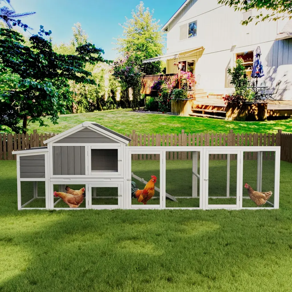 The ORRD 113.5" Gray Large Wooden Chicken Coop offers a spacious and secure home for 2–4 chickens or small animals. Crafted with durable wood and a waterproof, anti-UV roof panel, it provides excellent protection against sun and rain. The coop includes a nesting box for egg laying, a removable tray for hassle-free cleaning, and a secure lock to keep pets safe. With its extended run, chickens can roam freely while staying protected. Stylish in gray, this coop combines durability, functionality, and comfort for your backyard or farm.