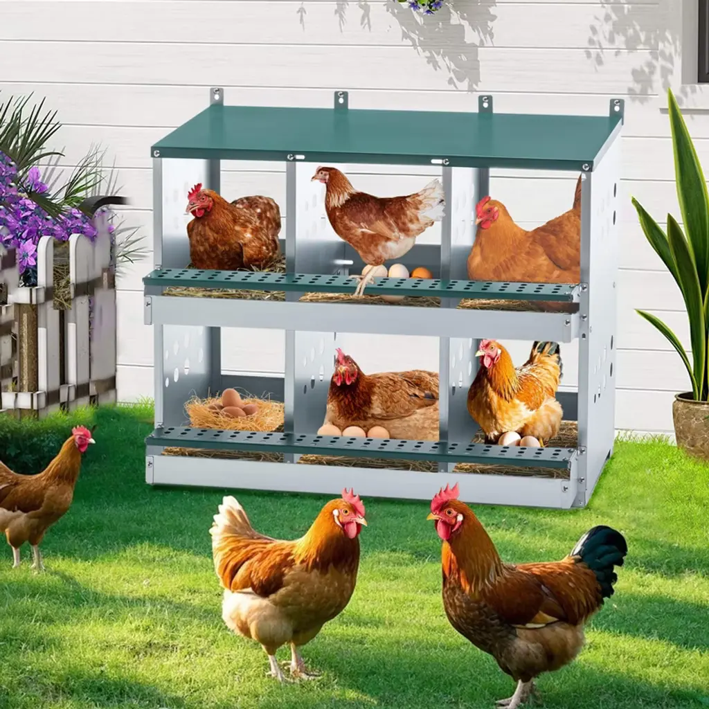 This 6-compartment green chicken nesting box features roll-away egg collection to keep eggs clean and unbroken. The durable plastic design provides private laying spaces for hens, with easy-access front openings and a sloped floor for automatic egg rolling. Ideal for backyard coops.