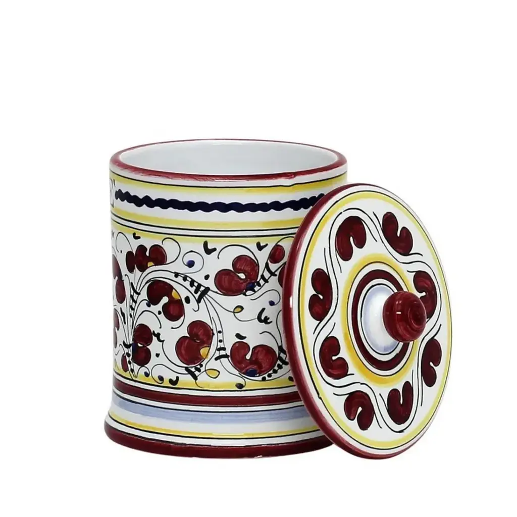 ORVIETO Green, Red, Blue Collections: The Orvieto (or Orvietano) design is a very old and traditional pattern that originated during the Renaissance in the hill-top town of Orvieto Italy. Truly one of Italy's most unique and interesting cities, Orvieto has a charming medieval character, mainly due to its celebrated Cathedral, a gem of Gothic architecture that took more than 100 years to build. The 'Galletto' (Rooster) pattern's main motif is a crowing rooster that symbolizes good wishes for blessings, prosperity and well-being. Hand made in Deruta-Italy. All Deruta of Italy products are lead and cadmium Free. Dishwasher Safe Not recommended for microwave use. Size: 4.5 DIAM. X 6 HIGH