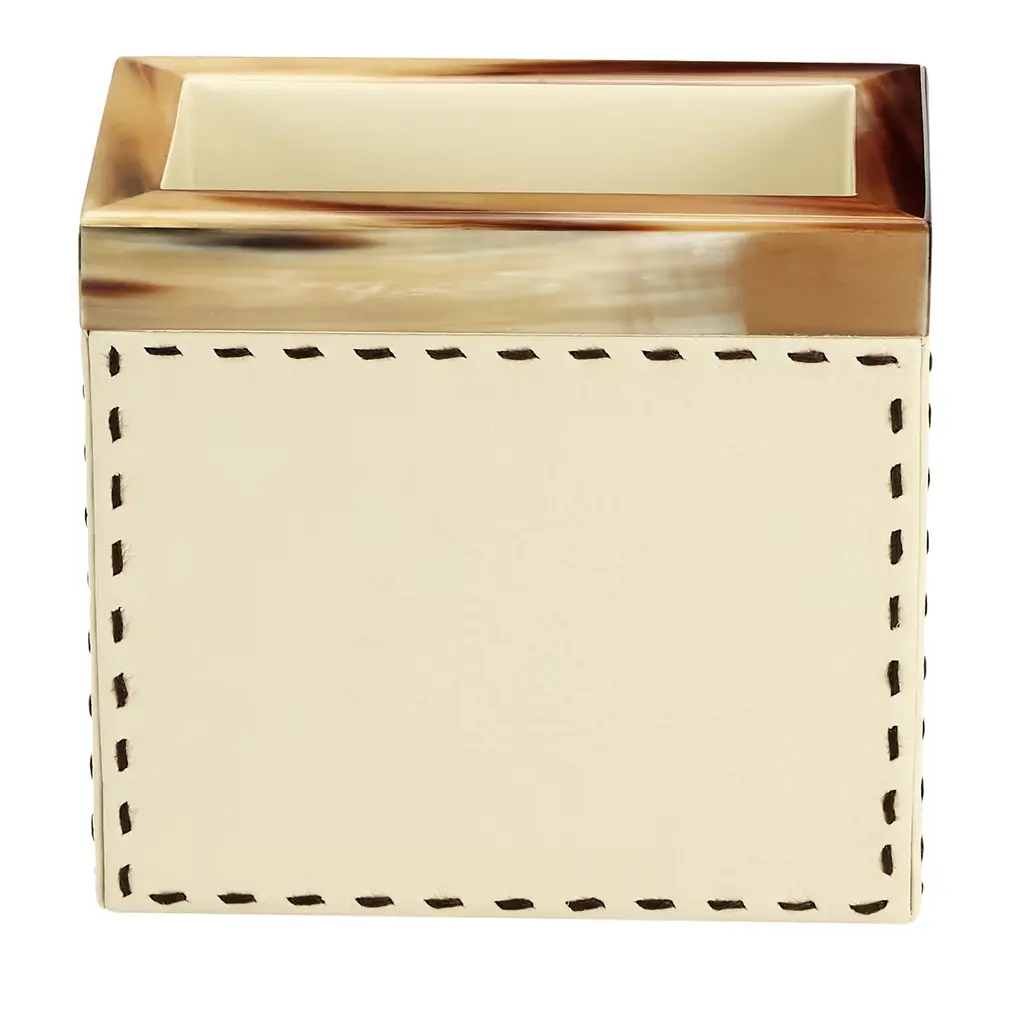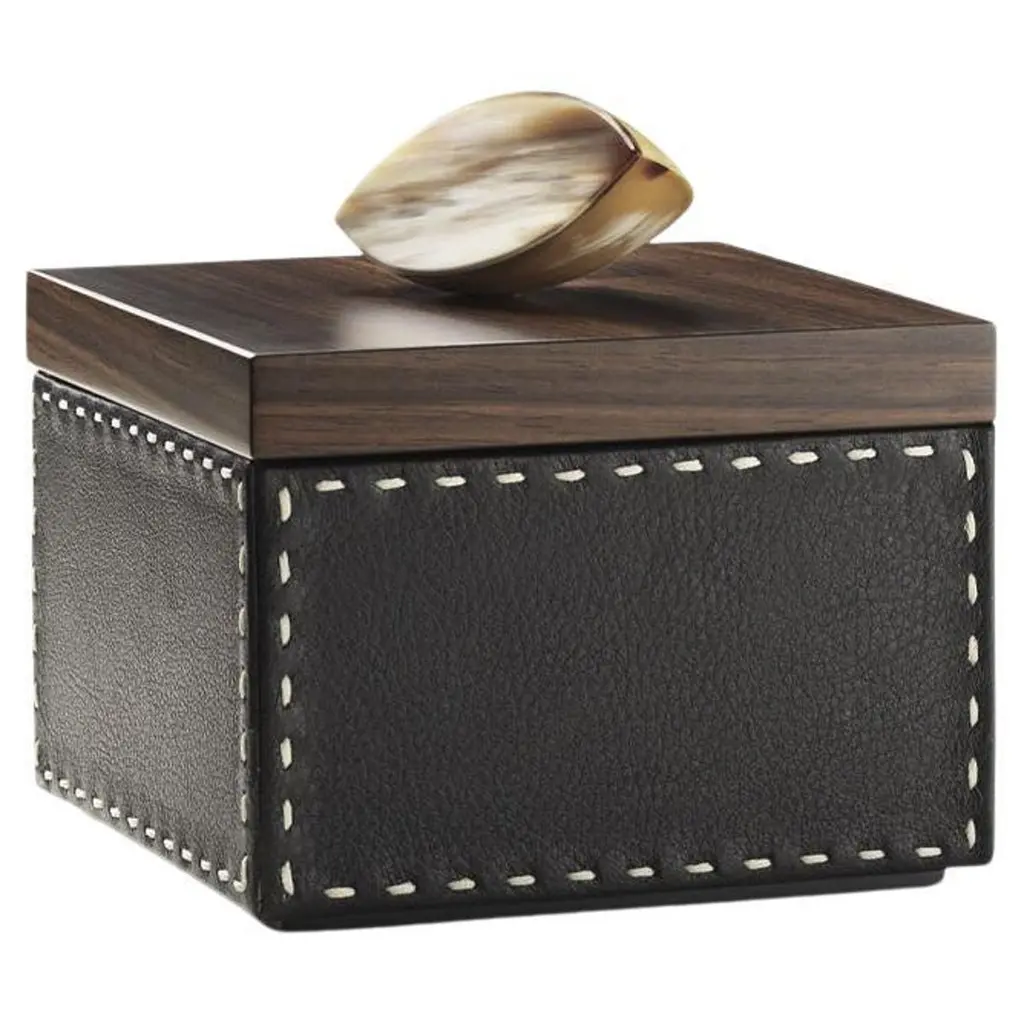 Exclusive materials marked by unrepeatable, natural grain and veins lend this tiny box its luxurious, unique allure. Prized matte Amara ebony characterizes the interior, while fine pebbled beige Aida leather with hand-sewn brown stitchings covers the sides. A distinguishing element completing the design is the lid in glossy-finished natural horn. A black version is also available in the Artemest catalog.