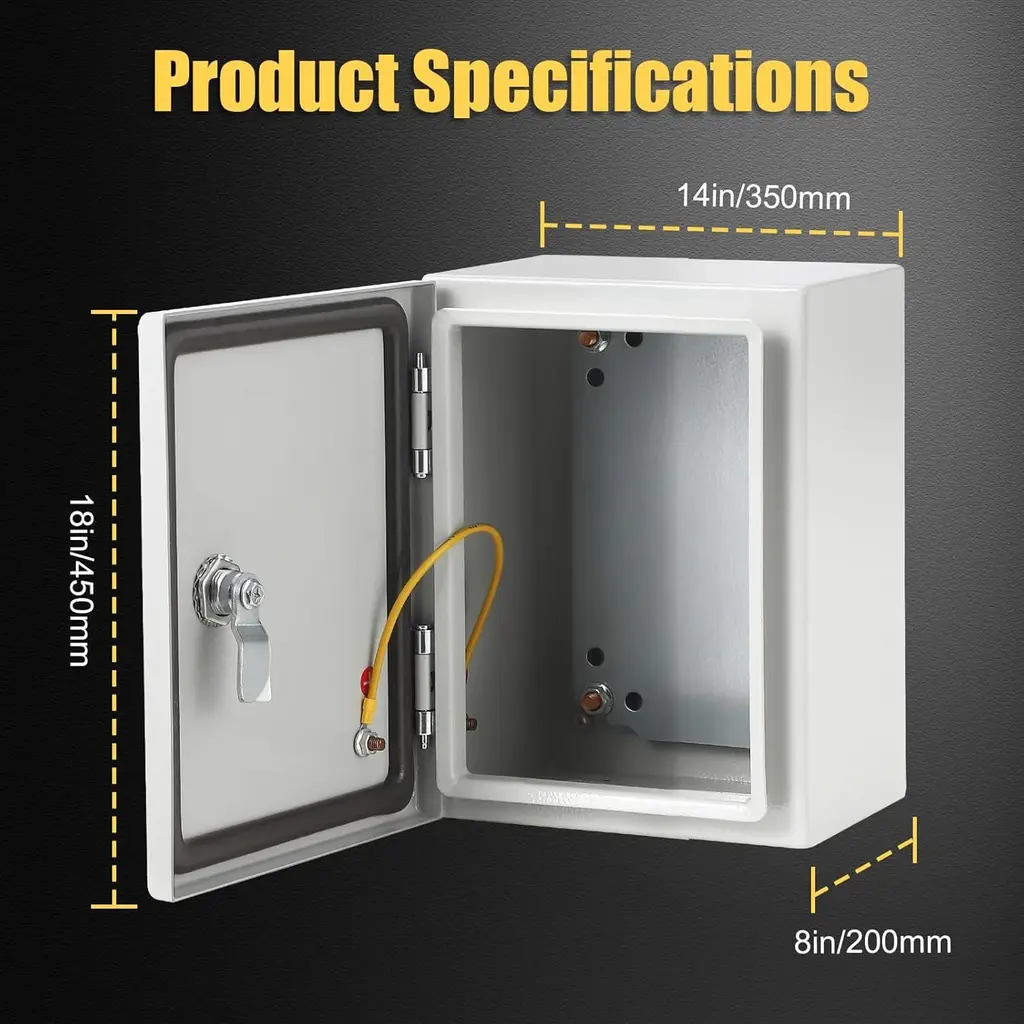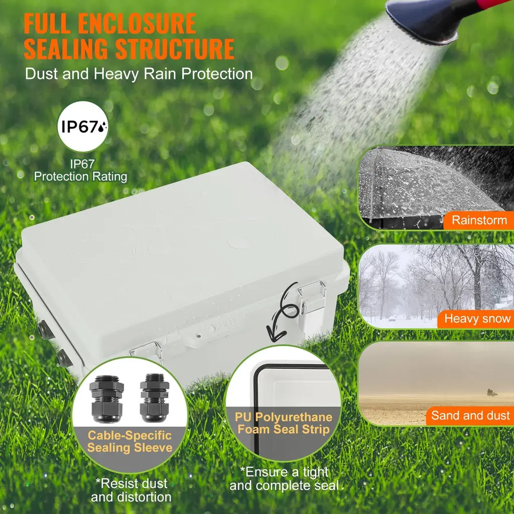 Spacious Interior Space: This waterproof box has external dimensions of 20.87 x 16.92 x 7.87 in/530 x 430 x 200 mm and internal dimensions of 19.01 x 15.08 x 7.12 in/483 x 383 x 181 mm / This waterproof box has external dimensions of 16.93 x 12.99 x 7.09 in/430× 330 x 180 mm and internal dimensions of 15.12 x 11.18 x 4.84 in/384 x 284 x 123 mm / This waterproof box has external dimensions of 13.78 x 9.84 x 5.90 in/350 x 250 x 150 mm and internal dimensions of 12.51 x 8.58 x 4.96 in/318 x 218 x 126 mm / This waterproof box has external dimensions of 11.81 x 7.87 x 7.08 in/300 x 200 x 180 mm and internal dimensions of 10.55 x 6.61 x 6.14 in/268 x 168 x 156 mm, providing ample space for convenient wiring of electrical components. If you find that the size doesn't meet your requirements, we offer multiple size options of the same high quality to ensure the best protection for your electrical components. Superior Waterproof & Dustproof: We use high-quality PU polyurethane foam sealing material to achieve an IP67 protection rating, representing level 6 dustproof and level 7 waterproof capabilities. It provides exceptional protection against water, rain, dust, snow, oil, and other environmental factors, ensuring that your electrical equipment remains unaffected by harsh conditions. It's the top choice for storing household electrical components! Impact Resistant to the Max: Our product achieves an IK08 impact resistance rating and can withstand 5J of impact force. It effectively protects internal components and ensures continued operation during an accidental collision. Our enclosure is constructed from 3.5 mm thick ABS material with a high hardness surface and wear resistance, making it perfect for outdoor use, even under direct sunlight. Your ultimate choice for impact-resistant and outdoor applications! Convenient && User-Friendly: The hinged cover, equipped with a 304 stainless steel door latch, allows for easy opening and secure closure, making it simple to check the operational status at any time. Paired with a detachable mounting plate, this junction box ensures that wires can be securely fastened and adjusted in different positions and angles. Experience hassle-free usage with our user-friendly junction box! Effortless Installation Made Simple: We've included 304 stainless steel accessories and a comprehensive screw set, providing robust support and hanging capabilities, ensuring that the junction box remains securely fixed to the wall for an extended period. Our detailed user manual walks you through the step-by-step installation of the mounting plate and junction box, making it accessible even for beginners. Get your electrical setup up and running quickly and effortlessly! Package Content 1 x Gray Cover 2 x 304 Stainless Steel Latches 1 x Mounting Plate 4 x 304 Stainless Steel Hooks 4 x Sets of Mounting Screws