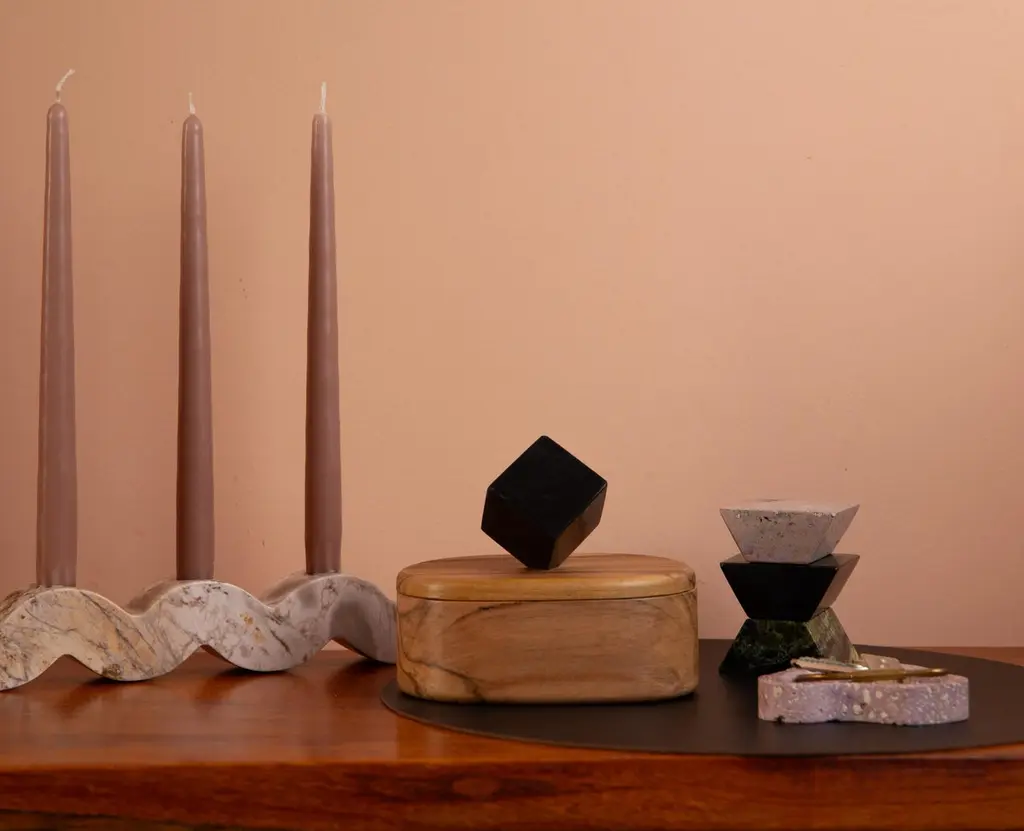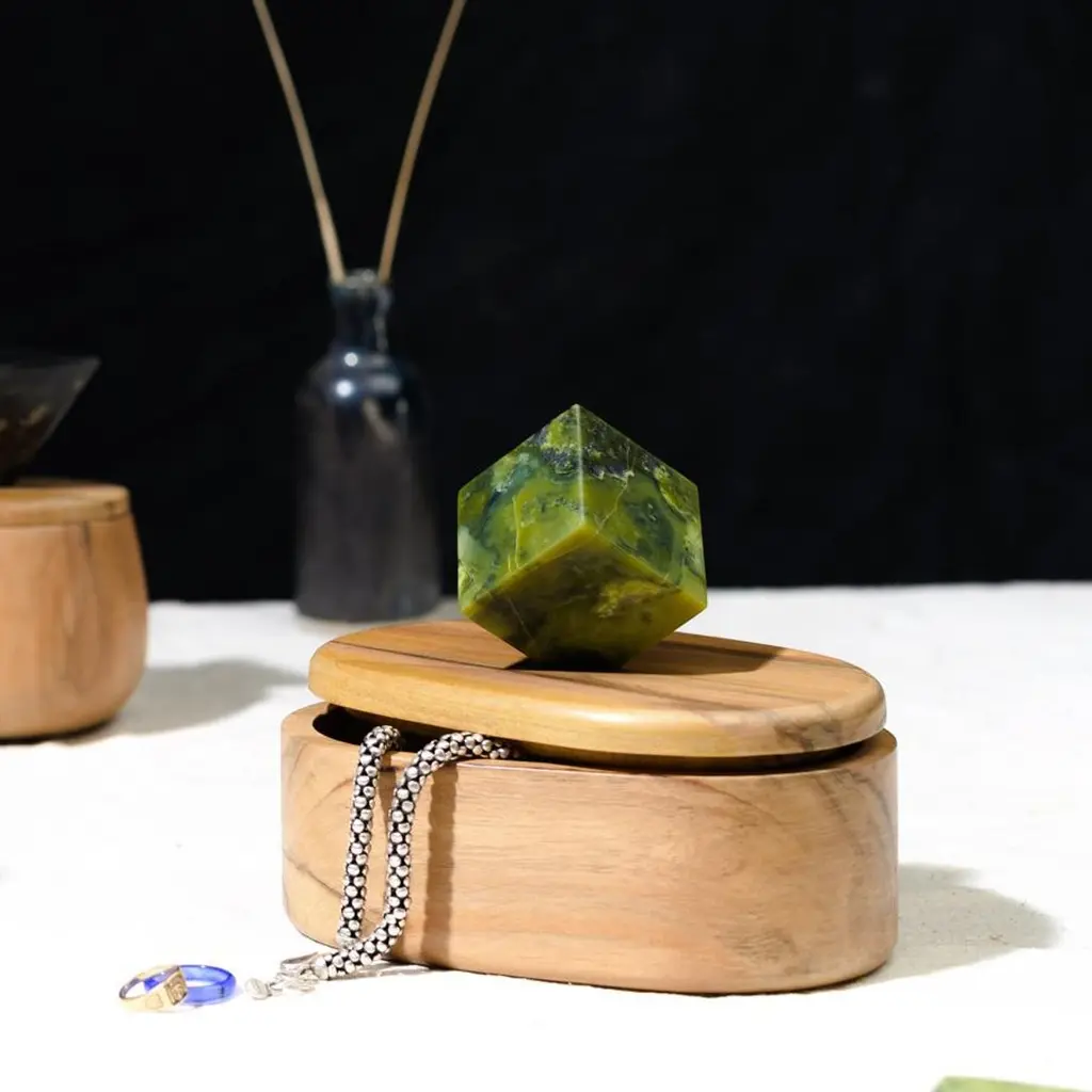 A natural stone jewel box for those who want organized living with eco-conscious materials.The oval everything box catchall box is a carved using traditional wood carpentry techniques in Magdalena de Cao, Perú. The cube-shaped gemstone handle is a geometric element that makes the moment of opening it up feel extra special.Dimension: 6 x 4 x 5.5 inWeight: 0.8LbMaterial: Serpentine, woodAbout this gemstone:• Green Serpentine is a unique stone formed of crystal-like minerals, ranging from lime green to deep pine - no two stones are exactly alike.• Carved from Andean Serpentine stone with provenance from the Huancayo region of Junin, Perú.• This stone is said to stimulate the digestive and glandular system, mitigating pain and tension.• On a psychic level, this stone is represented by the snake, acting as a shield to counteract aggressions and invasive vibrations.Handmade in Peru by DAR Proyectos.