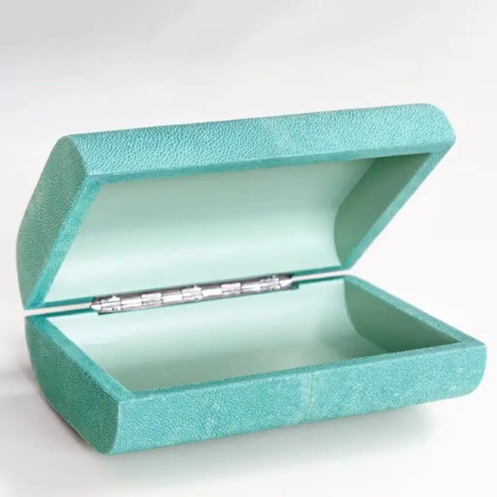 A stylish solution to securely store and showcase precious jewels, this wooden box with oval-cut sides distills fresh opulence. Precious turquoise galuchat leather fully envelops the exterior, while the interior sports a bright color-coordinated lacquer further attesting to the piece's modern character. Seductive to the touch thanks to its intriguing natural texture, each piece is entirely unique due to their handmade production.