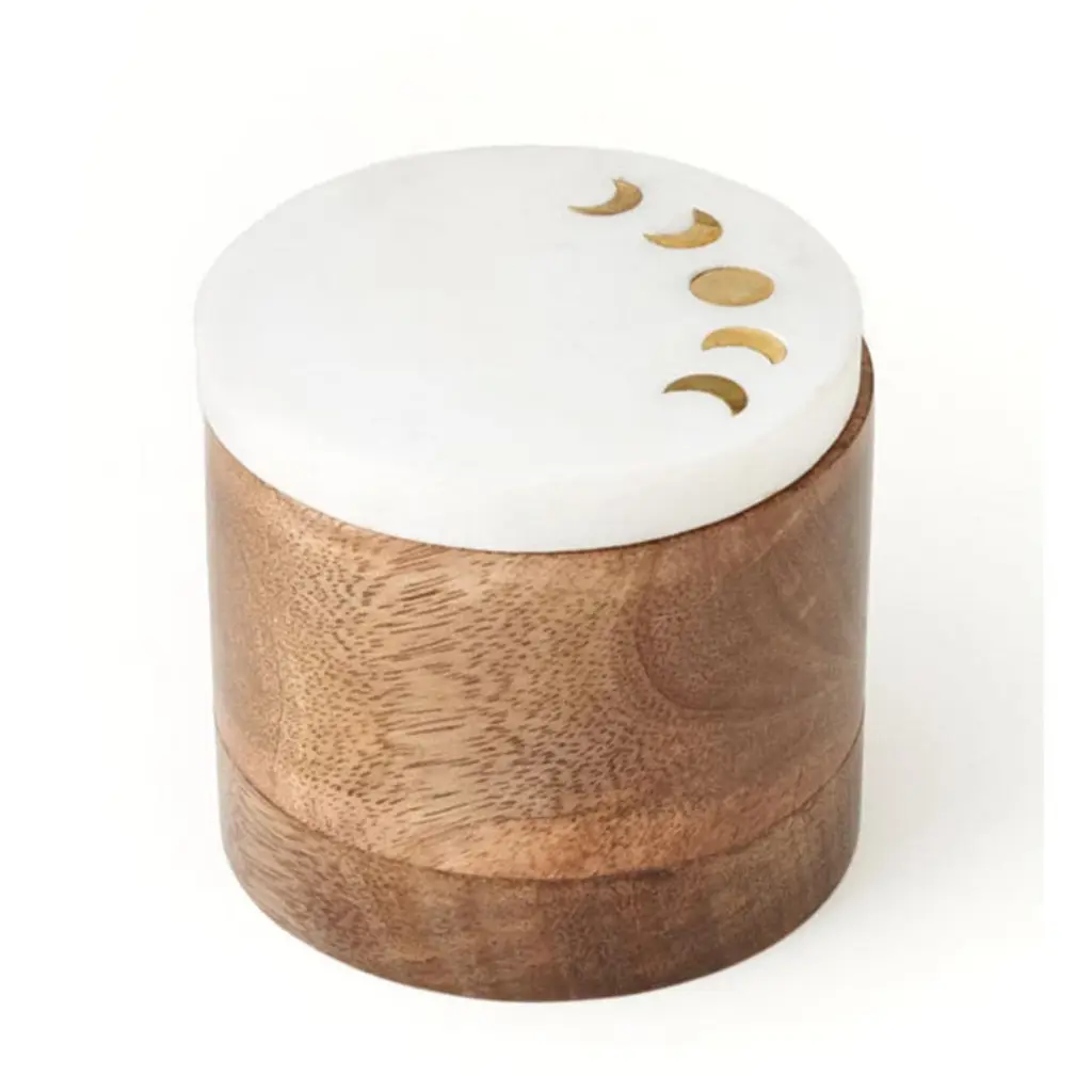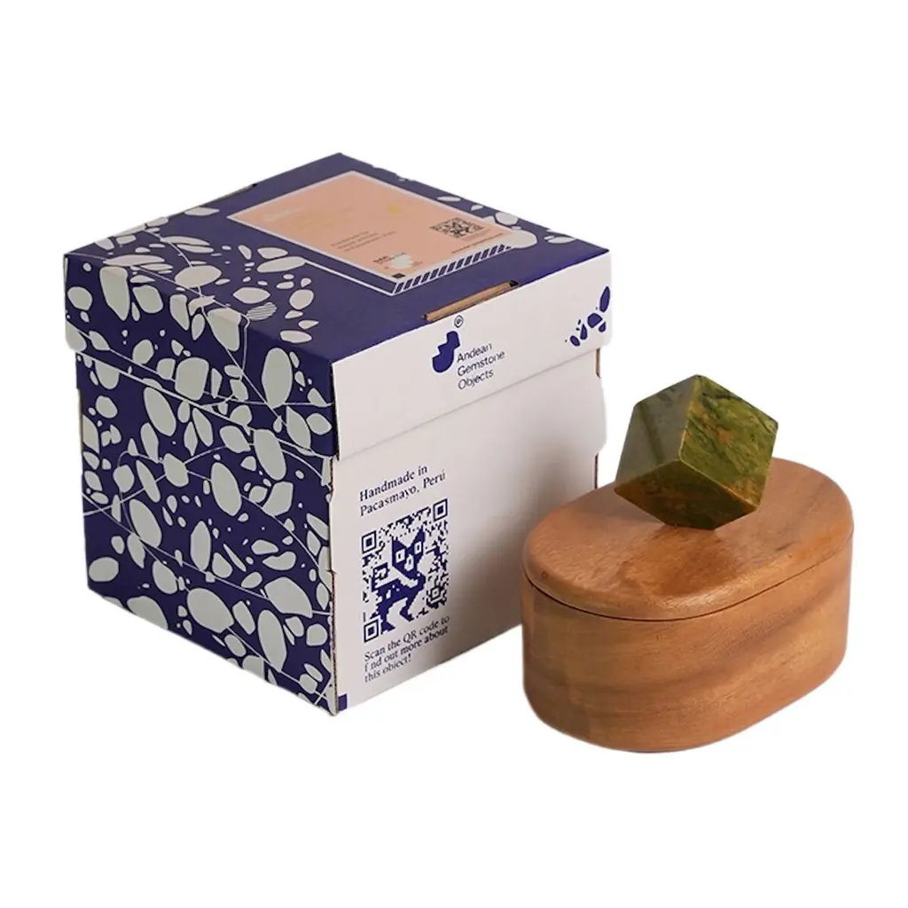 Contemporary oval-shaped jewel box carved from wood and gemstone. A dreamy accent for your nightstand, vanity, or desk to hold make-up, jewels, airpods, and more. The oval everything box catchall box is crafted using traditional wood carpentry techniques in Magdalena de Cao, Perú. The cube-shaped gemstone handle is a geometric element that makes the moment of opening it up feel extra special. Dimensions are 6″ long / 4″ wide / 5.5″ tall. Body and lid are carved from wood with a stone handle.