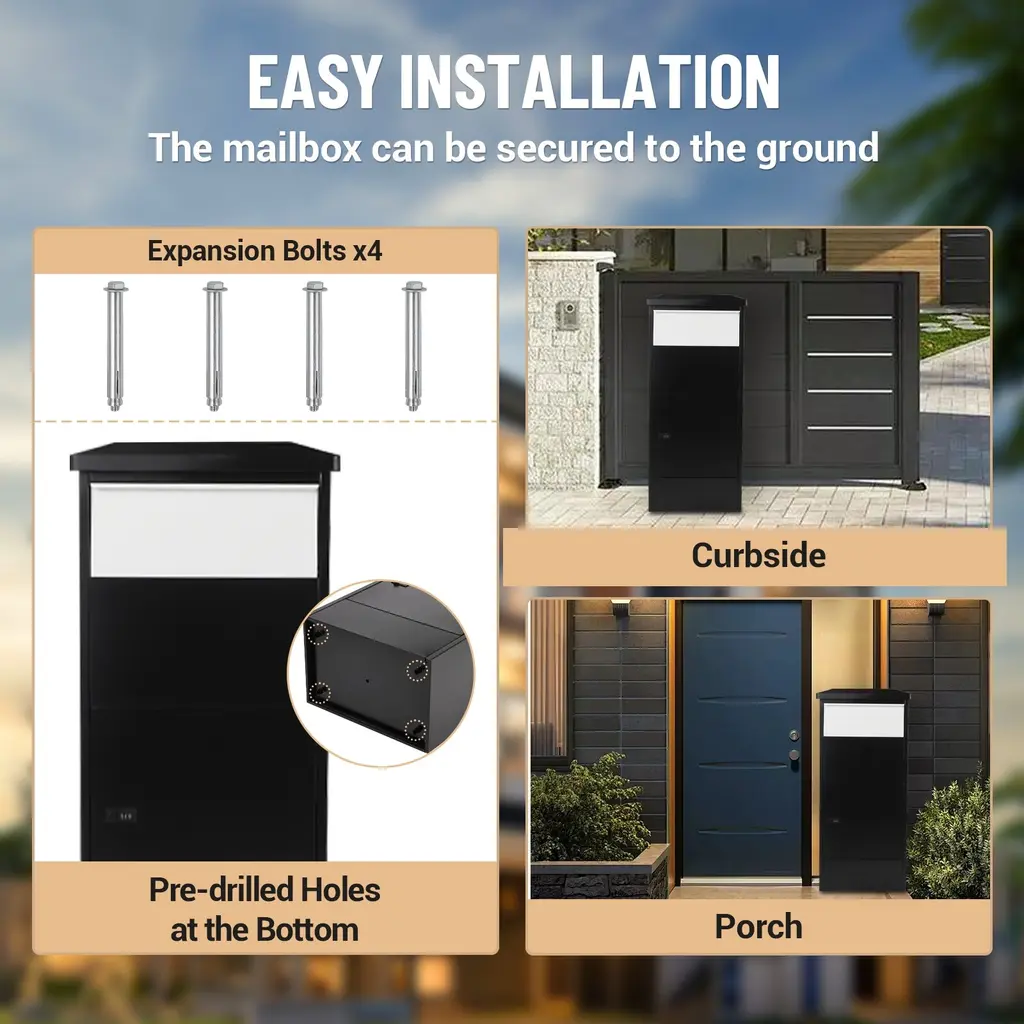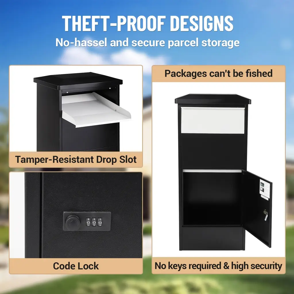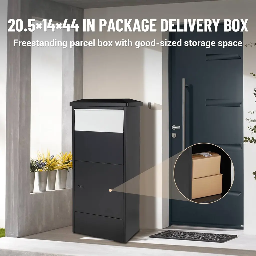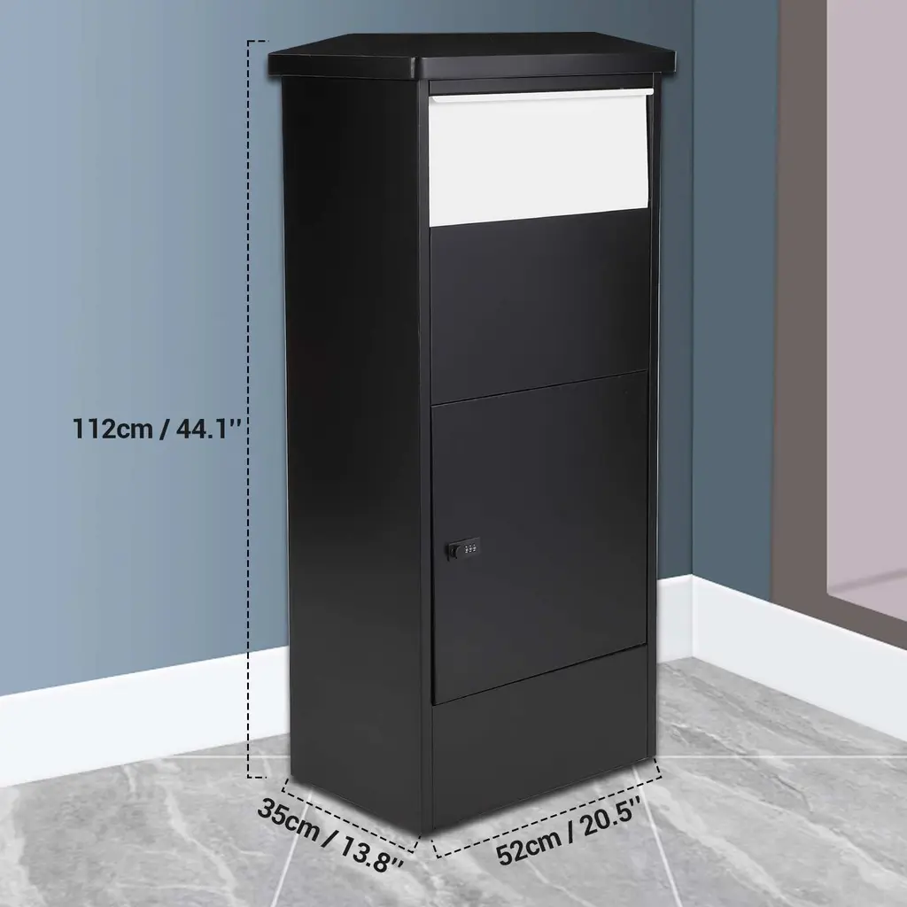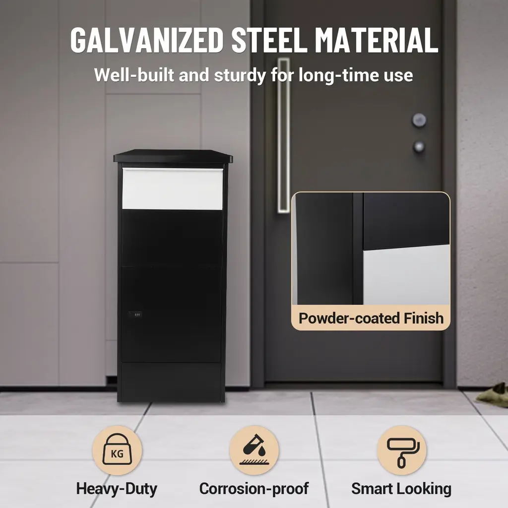 Premium Build Quality: This parcel drop box is constructed from sturdy galvanized steel, ensuring a modern, durable, and corrosion-proof design. With total dimensions of 20.5"x13.8"x44.1", it provides an ideal solution for your daily package deliveries, combining functionality with style. Weather-Proof Design: The box features a powder-coated, rust-proof finish for enhanced durability. It includes a protective drop slot flap that prevents rain and other moisture from entering, keeping your parcels safe and dry regardless of the weather conditions. Secure & No Keys Required: Designed with a reinforced theft-proof structure, this delivery box is equipped with a reliable code lock that eliminates the need for keys. The convenient flap drop slot offers an added layer of security, ensuring your packages are safe from theft. Effortless Installation: Installation is a breeze with pre-drilled holes located at the bottom of the box and included expansion bolts. You can securely mount it to your porch, yard, or curbside quickly and easily, ensuring it stands firm against storms and potential theft. Versatile Use: This package delivery box is perfect for receiving a wide variety of couriers. Its versatile design allows it to be placed conveniently in multiple locations such as porches, yards, or curbside, effectively meeting all your parcel delivery needs securely and conveniently.
