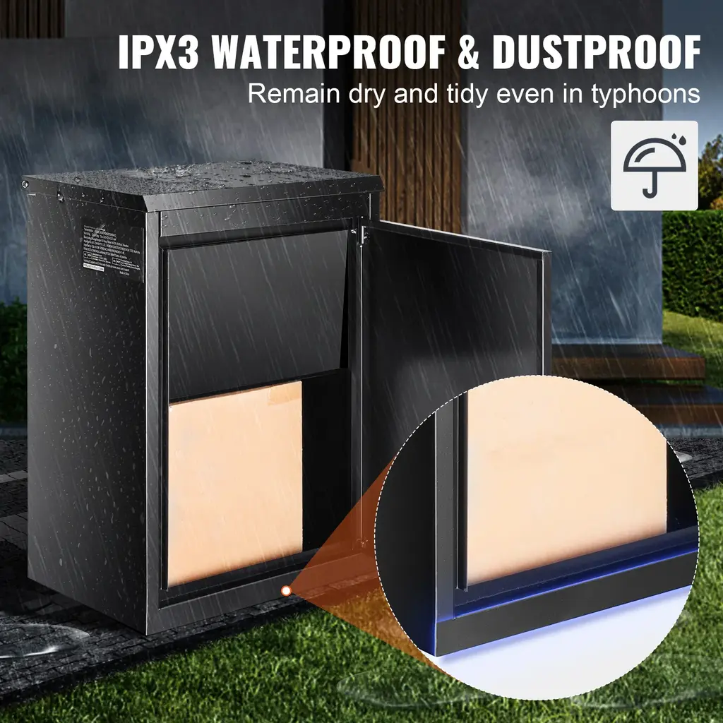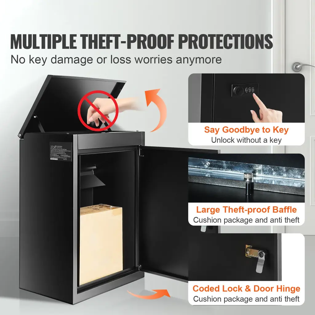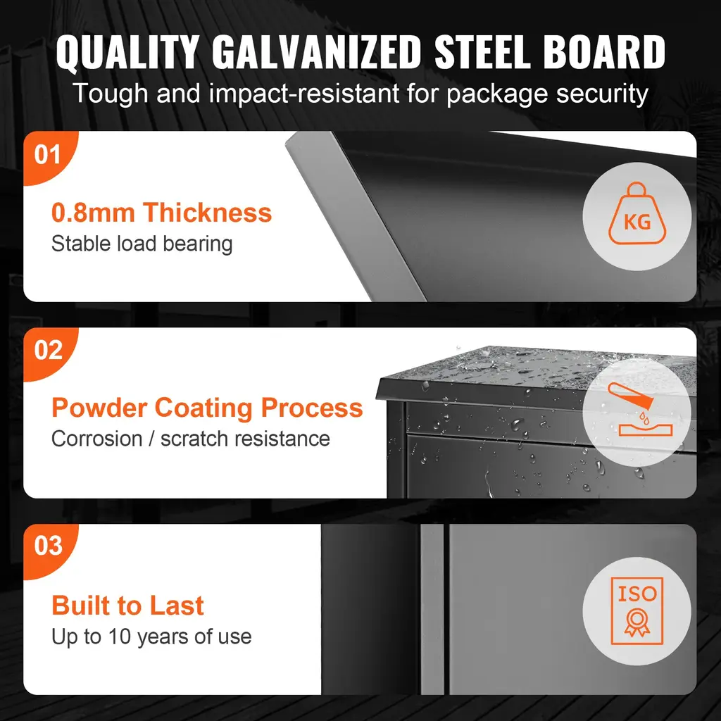 Multiple Anti-Theft Protections: Don't worry about losing keys and being unable to retrieve your parcels. 15.4" x 10.6" x 20.5" package delivery box for outside is equipped with a secure password lock and internal hinge to ensure your packages are well-protected. A large anti-theft baffle has also been added to the drop slot, preventing parcels from being fished out. Highly Durable: This locking mailbox is constructed from 0.8mm thick galvanized steel, and features a specialized coating through a spray process to prevent rust and scratches. Long-lasting lifespan of up to 10 years. IPX3 Waterproof Protection: Our IPX3-rated wall-mounted mailbox offers unparalleled defense against harsh weather conditions, including typhoons, and snow. The specially designed waterproof seals ensure your valuable packages remain clean and intact, no matter the elements. Generous Storage Capacity: With a robust weight capacity of 33-44 pounds and dimensions of 13.6 x 8 x 7.5 in for maximum package storage, this outdoor mailbox effortlessly accommodates your mail, magazines, and packages, helping you manage your deliveries with ease. Easy 3-Step Installation: With a set of screws and 4 pre-drilled holes on the back panel, you can easily install the extra large mailbox in just 3 steps on walls, porches, or curbside. Conveniently store and access to your packages anytime and anywhere ! Package Content 1 x Mailbox 1 x Anti-theft Baffle 4 x Self-tapping Screw 4 x Expansion Bolts