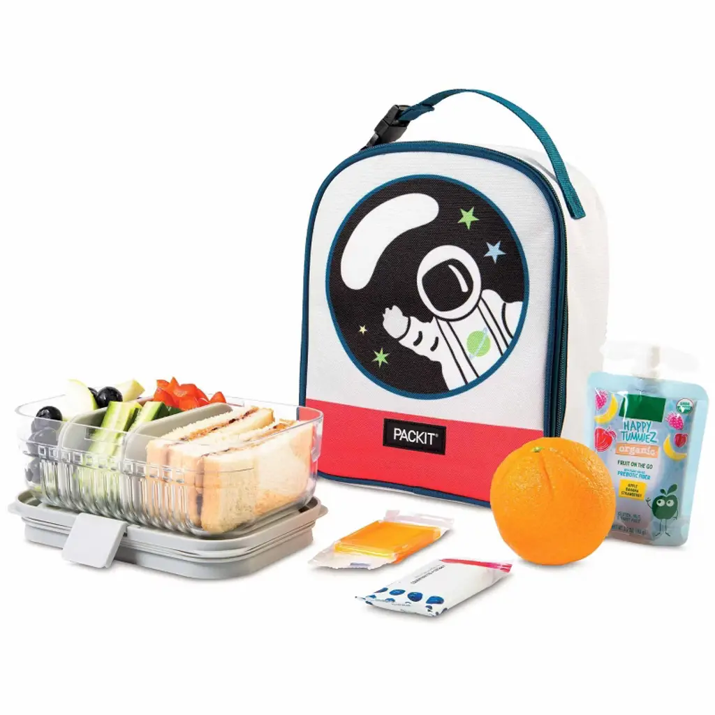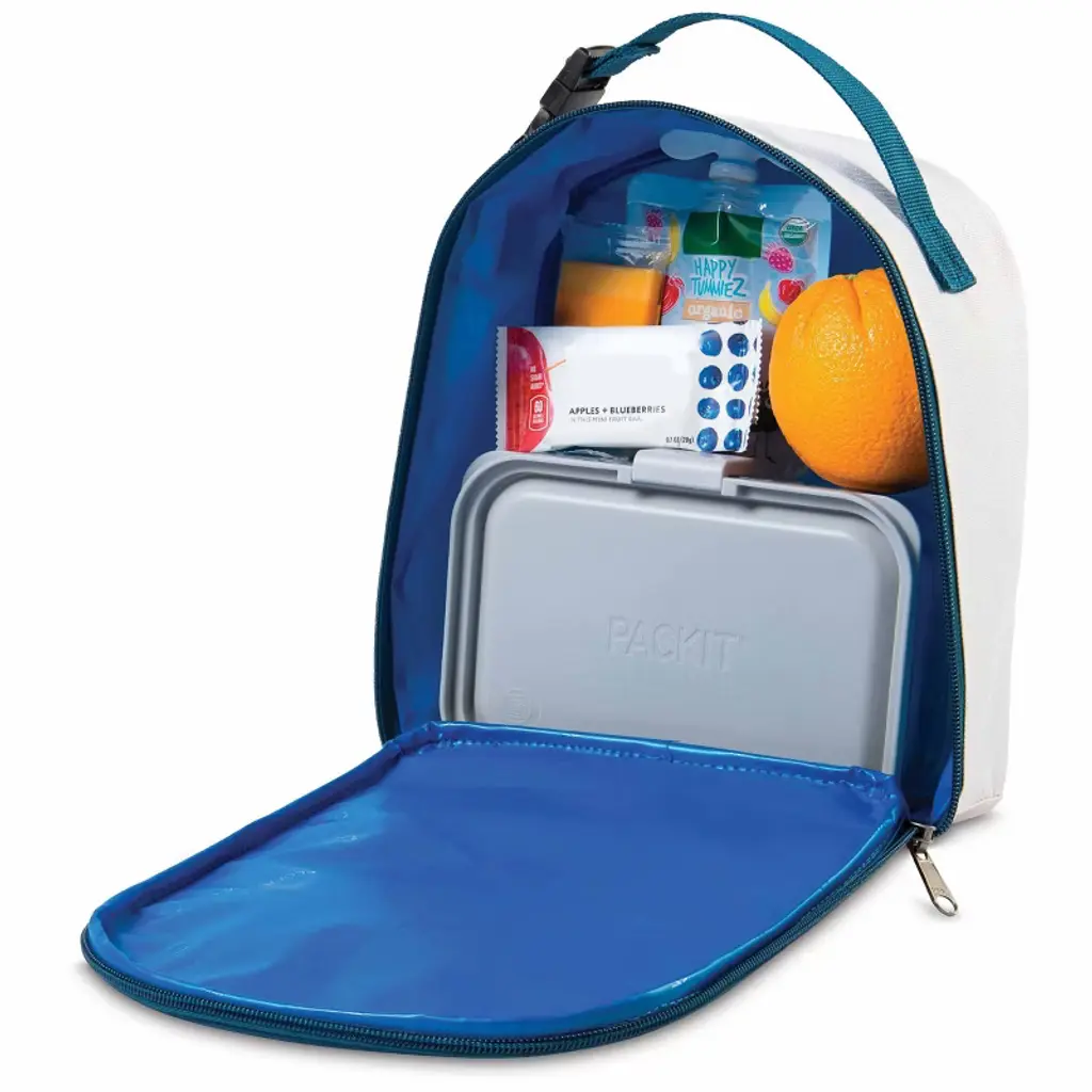 All-new, fun, this Freezable Playtime Lunch Box is perfectly sized for toddlers and school-aged kids. Easy to carry reinforced top handle with a buckle clip can attach to other bags, making it the perfect kids lunch box. Designed with PackIt's patented EcoFreeze™ technology: freezable gel built-into the walls of the lunch box. The smart design eliminates the need for separate ice packs or gel packs. It's freezable, it's reusable, and it actually cools for hours. Spacious cool interior is ideal to chill healthy lunches and snacks throughout the day. Just freeze, pack and go!To use, just collapse and freeze the lunch box overnight. This soft sided lunch box is made with nontoxic gel and gel liner. The unique folding system allows the box to collapse flat for storage in the freezer. Like all PackIt products, the Playtime Lunch Box is made from PVC free, BPA free, phthalate, and lead free (UL #B80321985, 12/5/2019) materials. PackIt's Freezable Playtime Lunch Box measures 10 inches tall, 8 inches wide and 4 inches deep. Cleaning is easy: wipe thoroughly or hand wash the interior and spot clean exterior; allow bag to dry completely before freezing. Not machine or dishwasher safe.