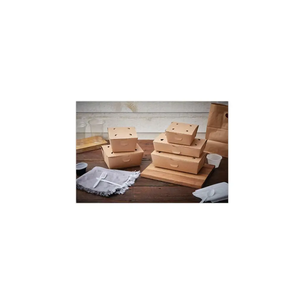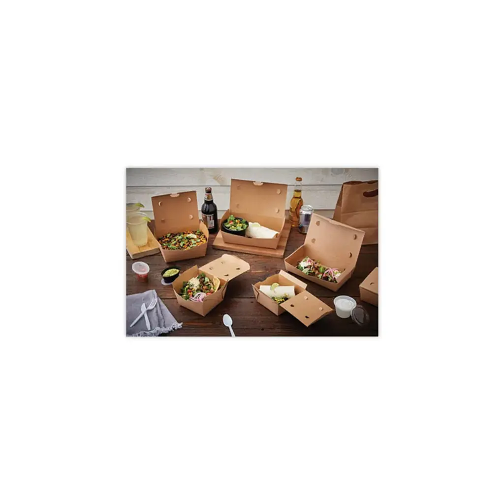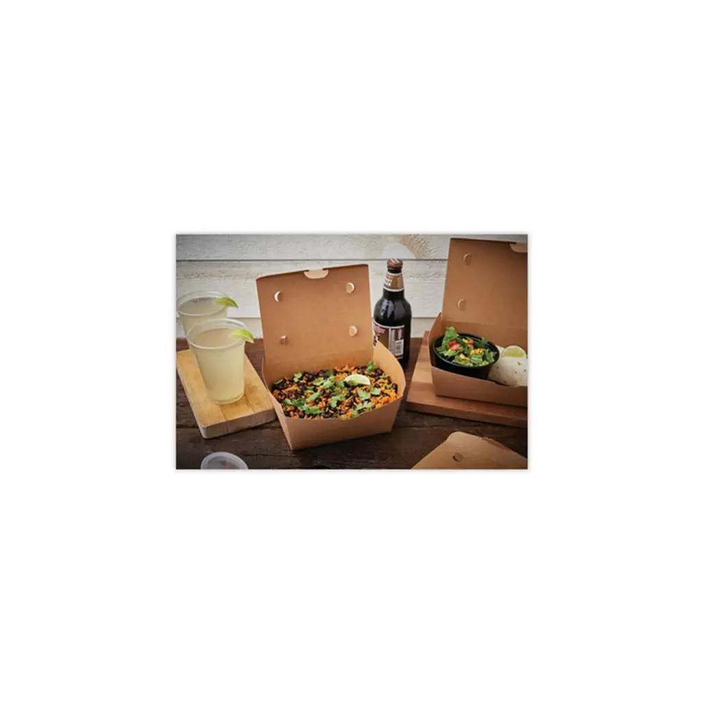 Pactiv EarthChoice OneBox Paper Box, 66 oz, the perfect alternative to plastic containers. EarthChoice OneBox paper boxes help food prep and assembly run smoothly and stay mess-free thanks to a secure front latch closure. Send orders out with confidence using these easy to close, leak proof, paper containers that come pre-assembled.