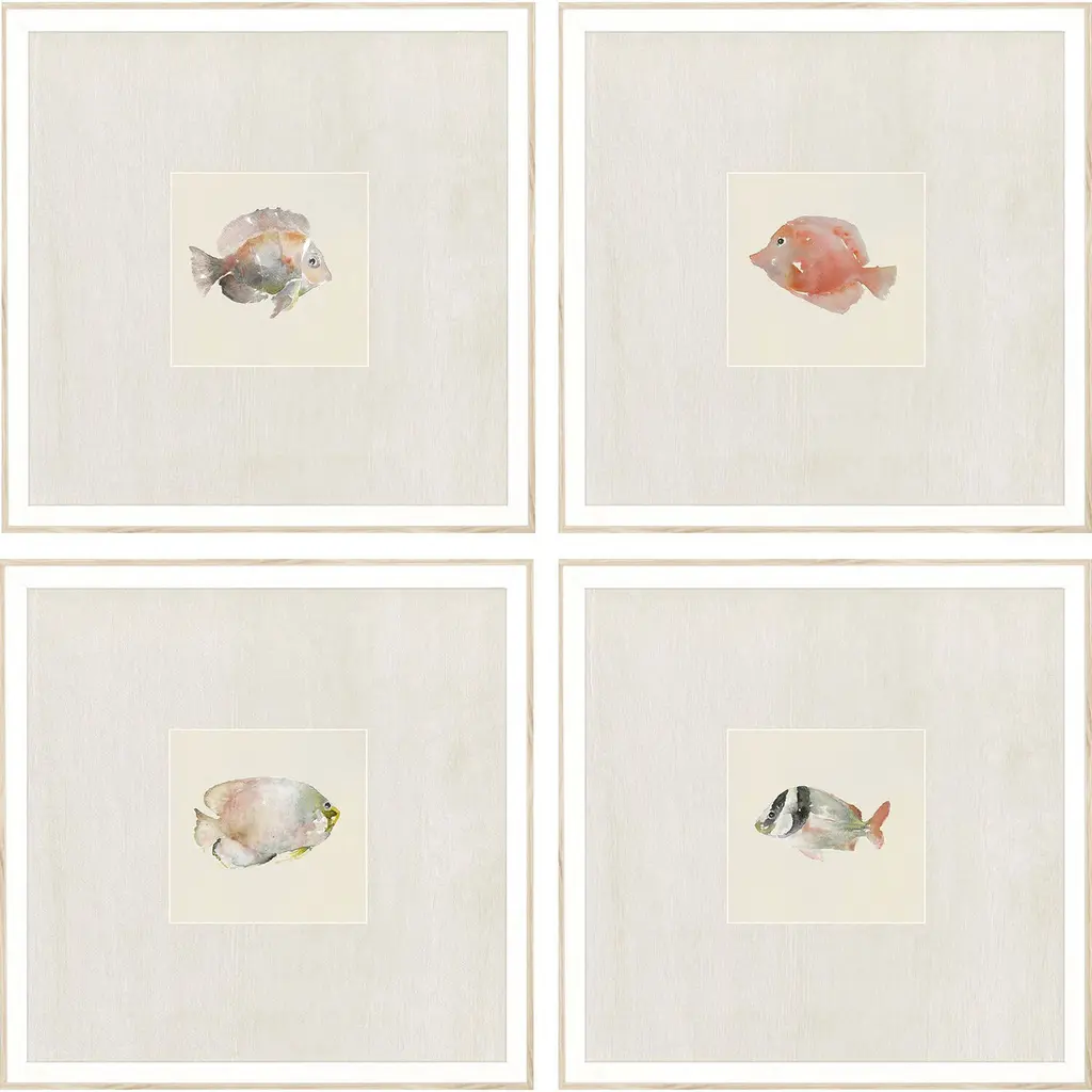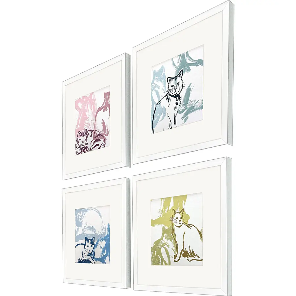 A series of colorful cat prints are matted in white. They are framed in a modern flat profile molding with a matte white finish.