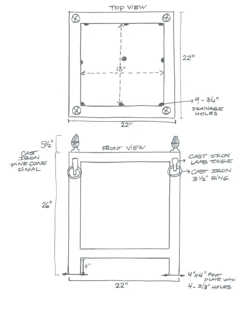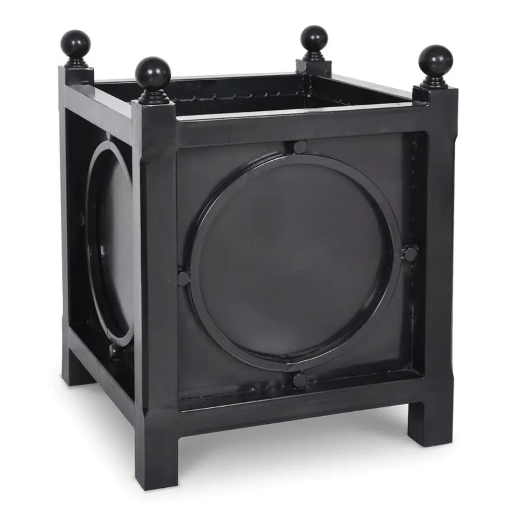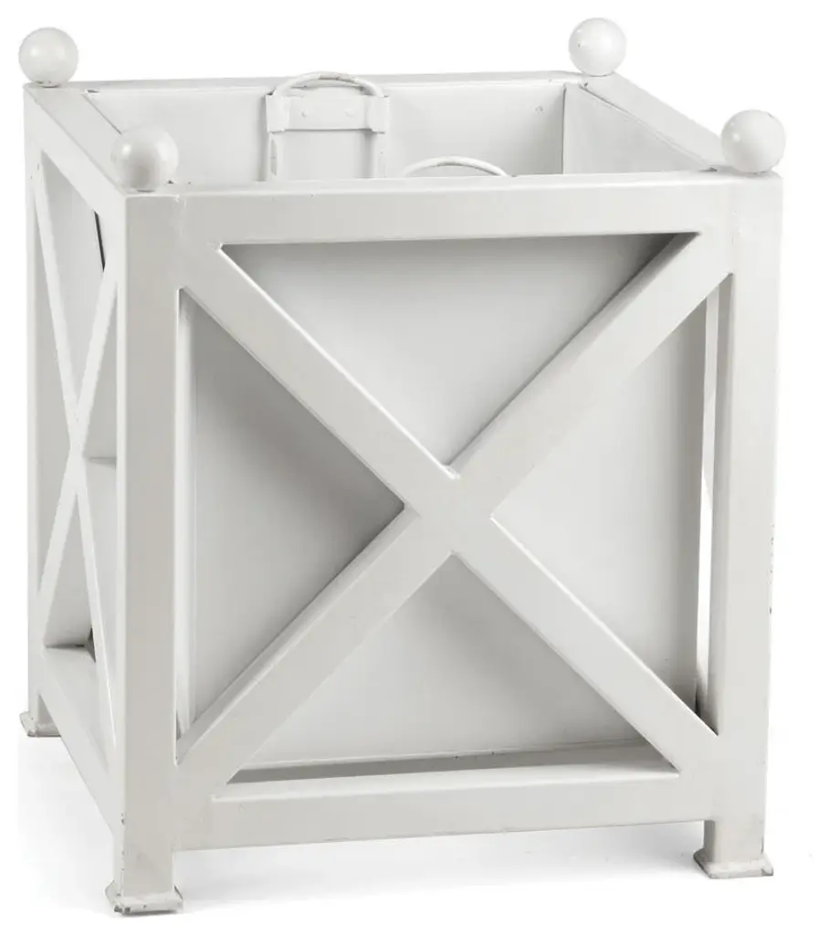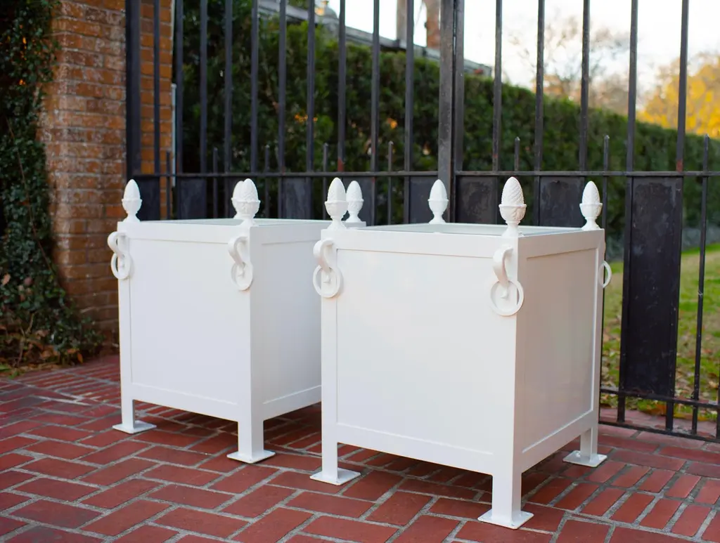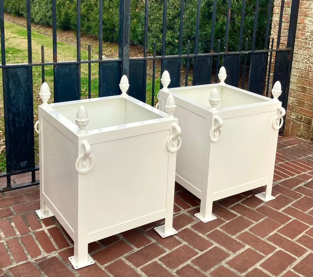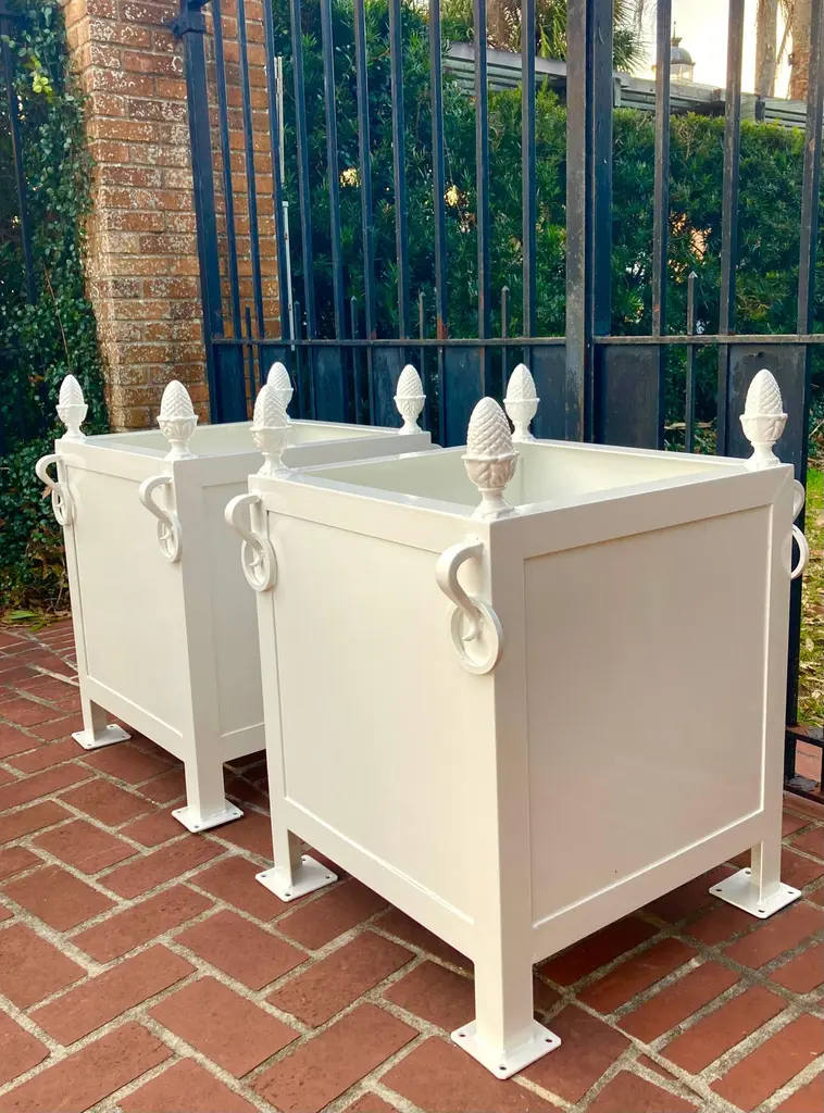 Pair of Large Square French Style steel and cast iron orangerie planter boxes in lacquered white (as these are custom made to order, customers may request any color from the Benjamin Moore collection). Handcrafted in New Orleans by local metalsmiths using 14 gauge steel and cast iron, using centuries’ old French techniques. Each planter is raised to allow drainage through drilled holes on bottom plate. Corner posts are topped with a pinecone finial, an ancient symbol of open-heartedness. Specially crafted finishes offer durable protection while retaining a unique patina. Each planter is made by hand and is one of a kind. If a different color than lacquered white is preferred, this planter can be customized in size as well as color from the Benjamin Moore Color Chart. Allow 6 to 8 weeks for production for custom orders.Story of the French Orangerie Planter in New Orleans: Dawn in the French Quarter, maybe 200 years ago, maybe today. Even deserted, the streets still pulse with the life unfolding behind closed doors. Those doors—whether humble streetside entrances or grand portes cochères—mark personal sanctuaries, islands of intimacy. A solitary wanderer might wonder: Who is inside? What are they like? Many French Quarter residents leave clues, like the pairs of orangerie planters flanking neighborhood entryways. Built to last yet offering the formal beauty of fruits and flowers, these planters offer a timeless greeting: True hospitality knows no strangers.We make our orangerie planters by hand in New Orleans, to honor our city’s tradition of generous living. Local metalsmiths use 14 gauge steel and cast iron, using centuries’ old French techniques. We top each planter corner with a pinecone finial, an ancient symbol of open-heartedness. Specially crafted finishes offer durable protection while retaining a unique patina. Each pair of planters is one of a kind, all are heirloom pieces to be enjoyed by generations of friends and family. And passersby who remain at a distance? They too receive a fleeting but heartfelt welcome.