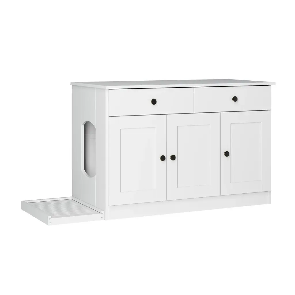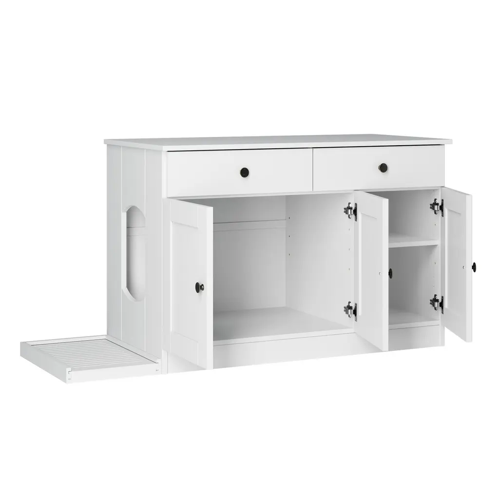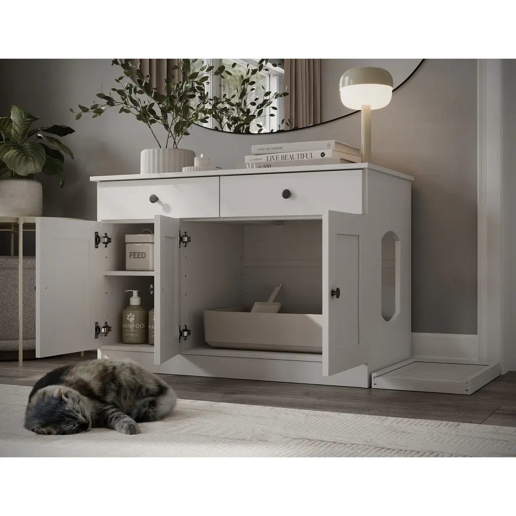 Palace Imports 100% Solid Wood Ziva 3-Door Cat Litter Box Enclosure With 2-Drawers And Litter Catch - White