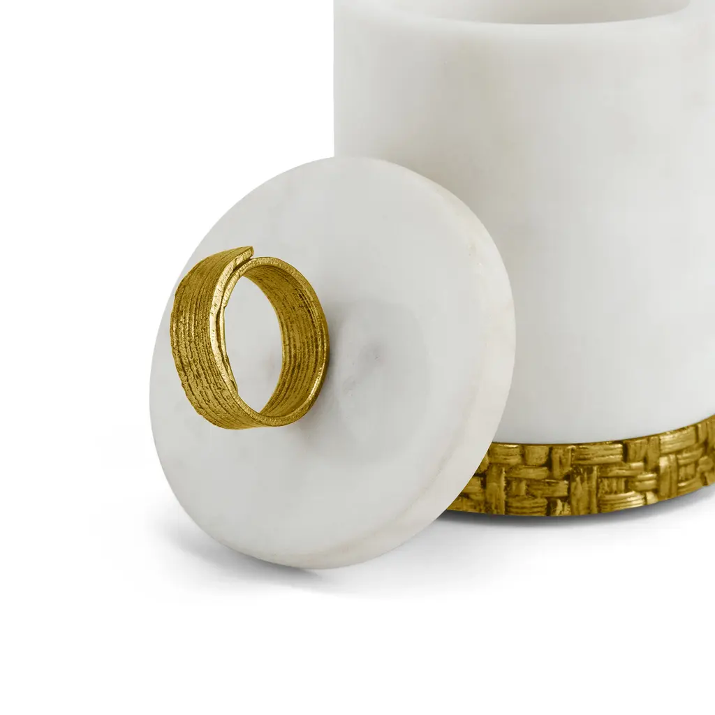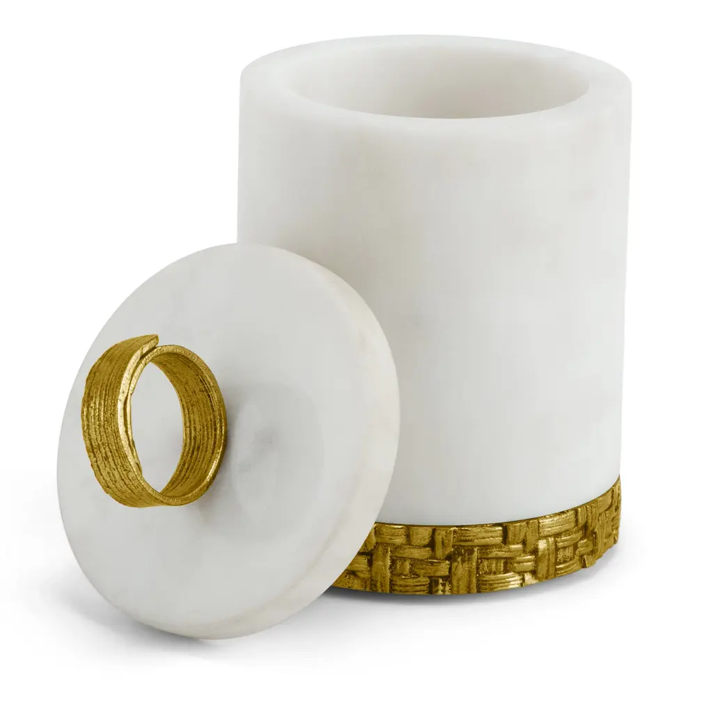 Inspired by the natural beauty of palm fronds, the Palm bath accessories collection by Michael Aram pairs luxurious, sleek marble and stainless steel with sculpted antique gold-tone accents.