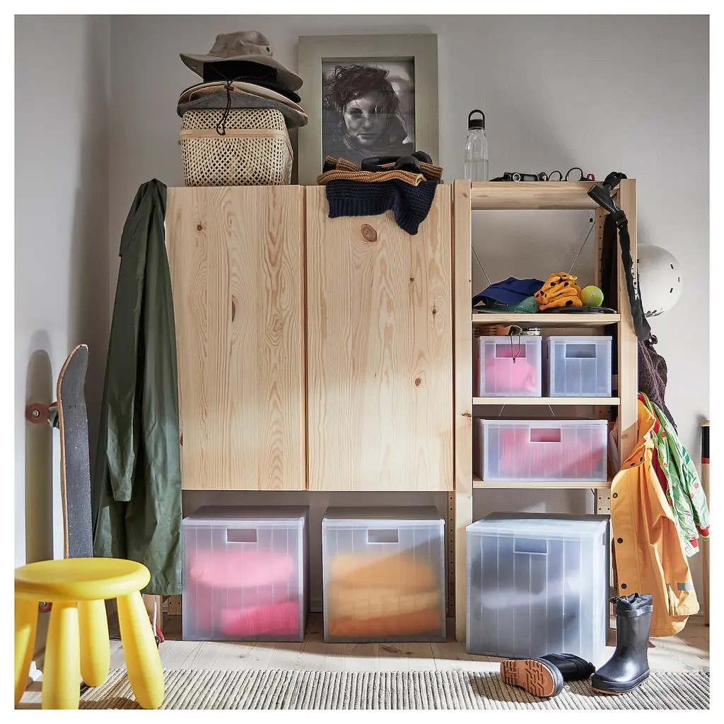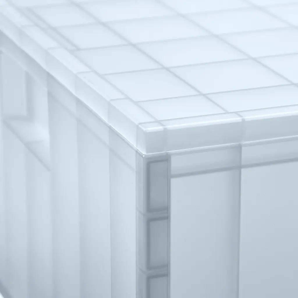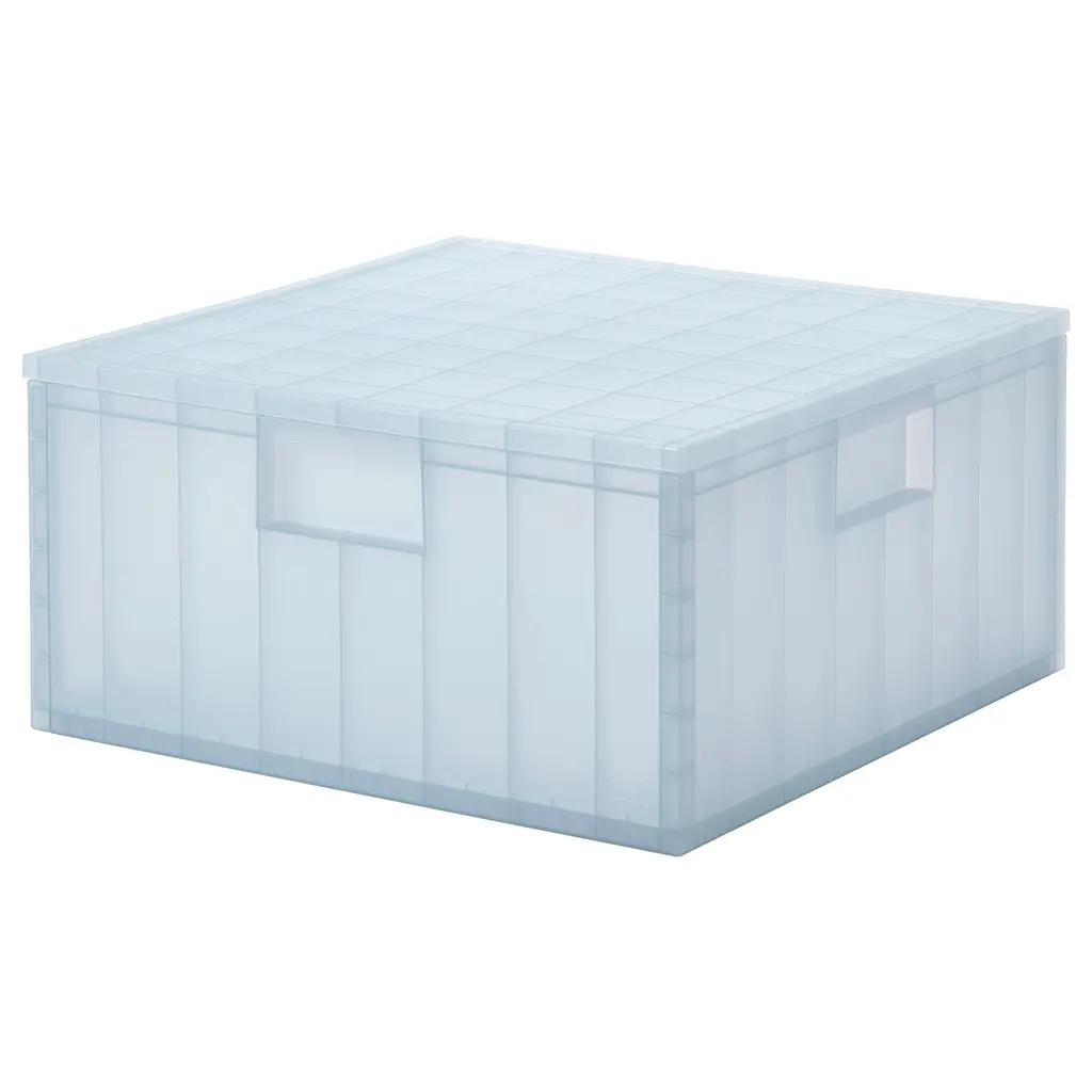 PANSARTAX Storage box with lid - transparent gray-blue 13x13x6 ½ ". You can easily see what’s inside and find what you’re looking for since the material is partly transparent. Fits in the VIHALS, BESTÅ and KALLAX storage series as well as in other storage with a depth of at least 13 in.