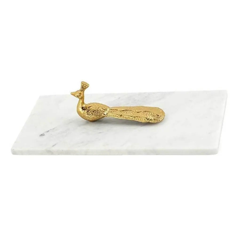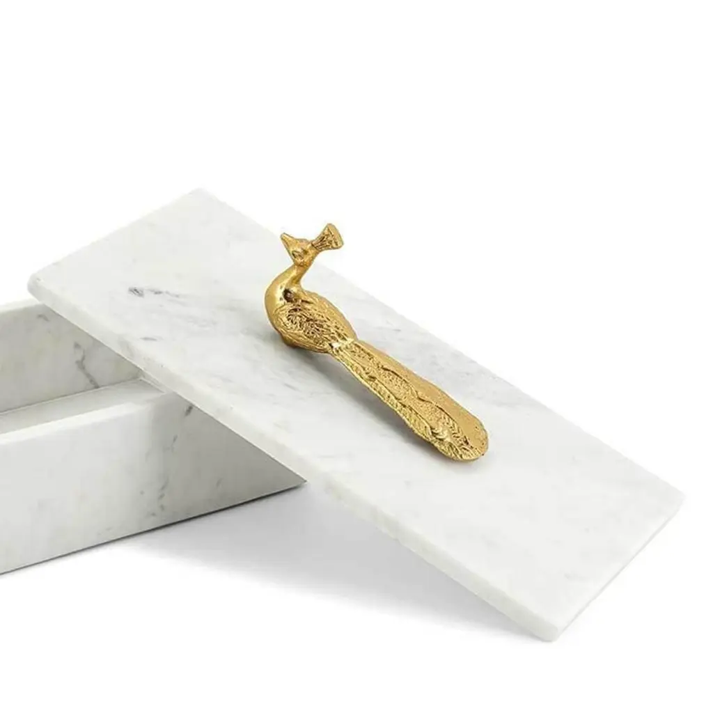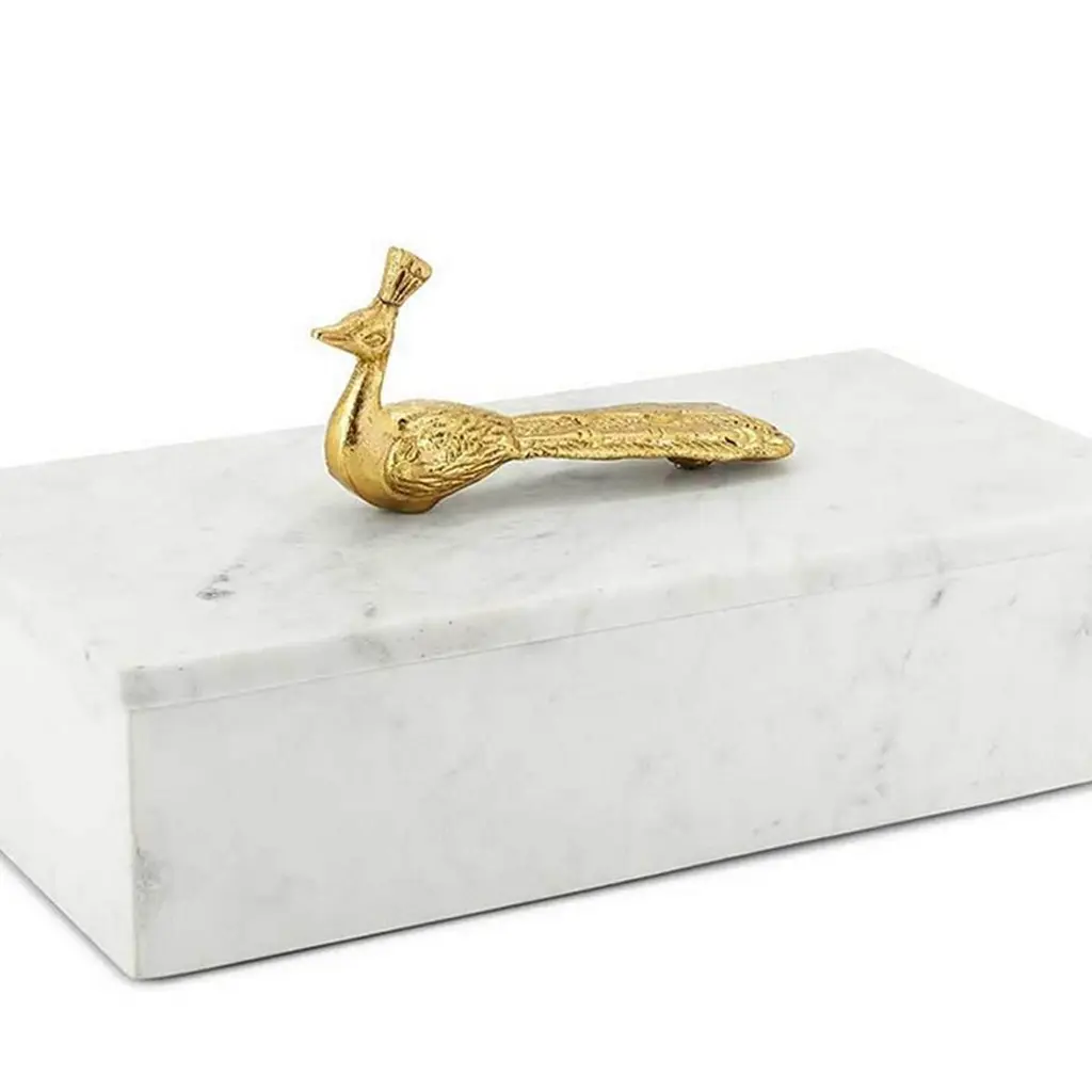 Box Paon Stone in white stone, boxwith lid with gilded metal peacock onthe lid.